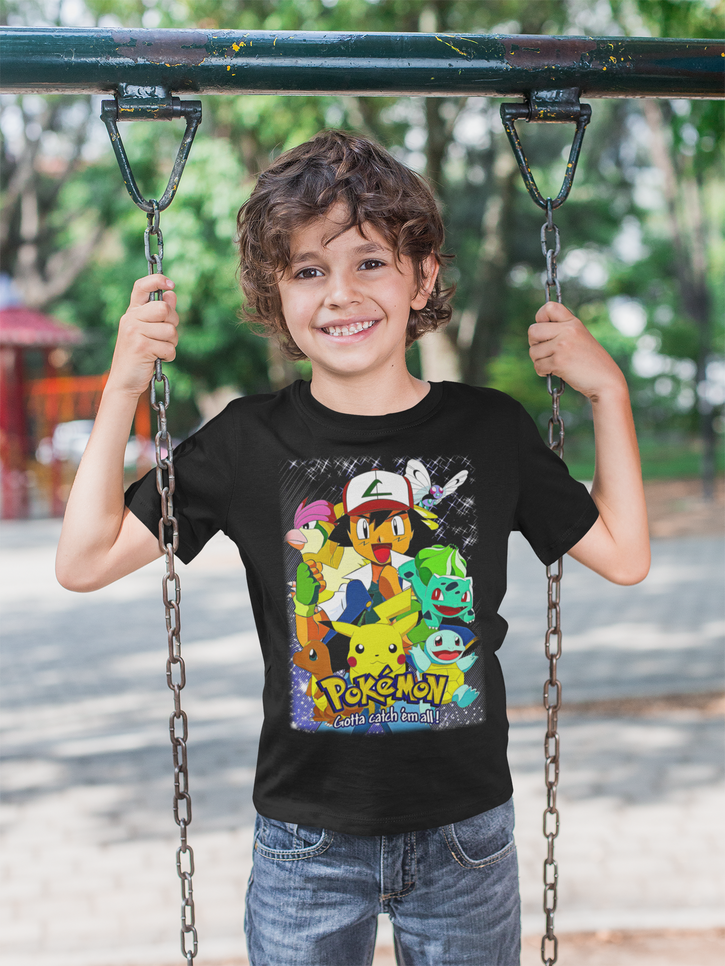 Dziecięca koszulka z postaciami z popularnego anime Pokemon.