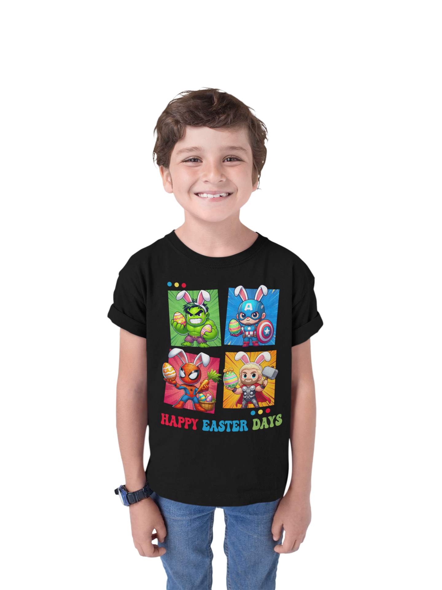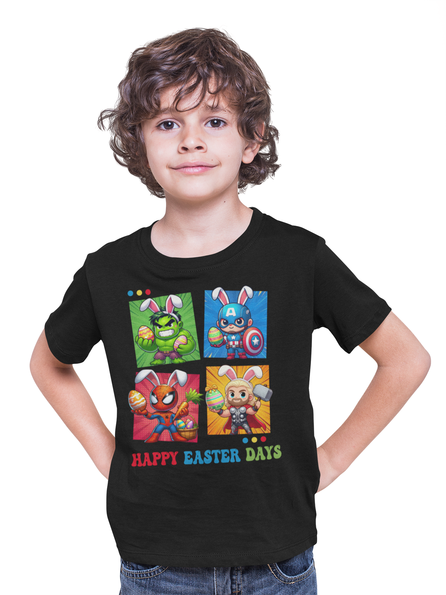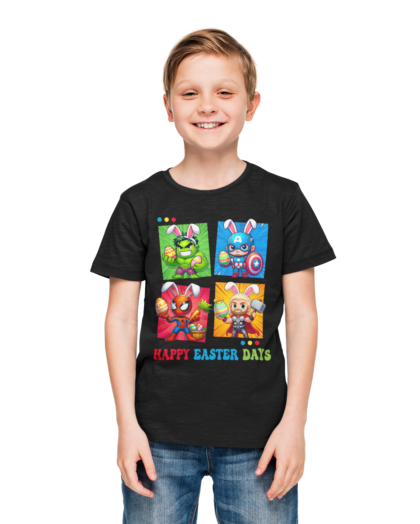 DZIECIĘCA KOSZULKA ŚWIĄTECZNA WIELKANOC HAPPY EASTER DAYS BOHATEROWIE MARVELA