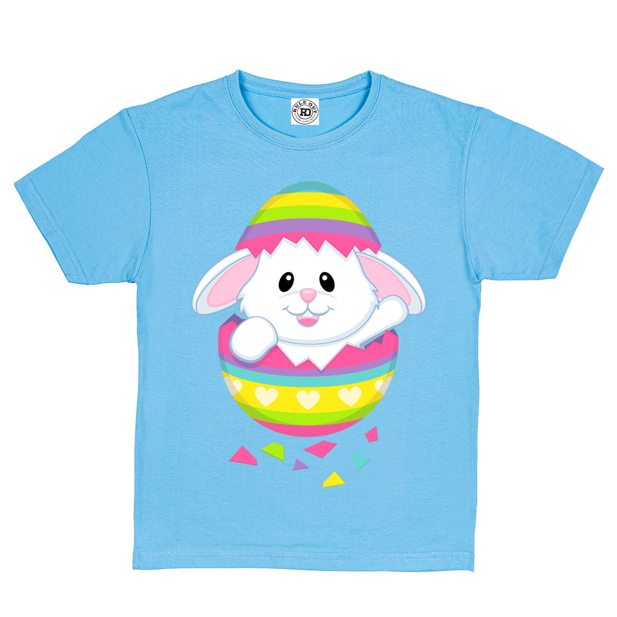 T-shirt dziecięcy z nadrukiem wesołego króliczka - idealny na prezent do koszyczka od zajączka wielkanocnego.