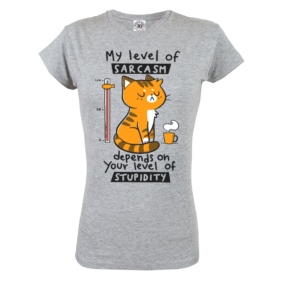 KOSZULKA DAMSKA Z KOTEM DLA MIŁOŚNICZKI KOTÓW KOCIARY MY LEVEL OF SARCASM DEPENDS ON YOUR LEVEL OF STUPIDITY