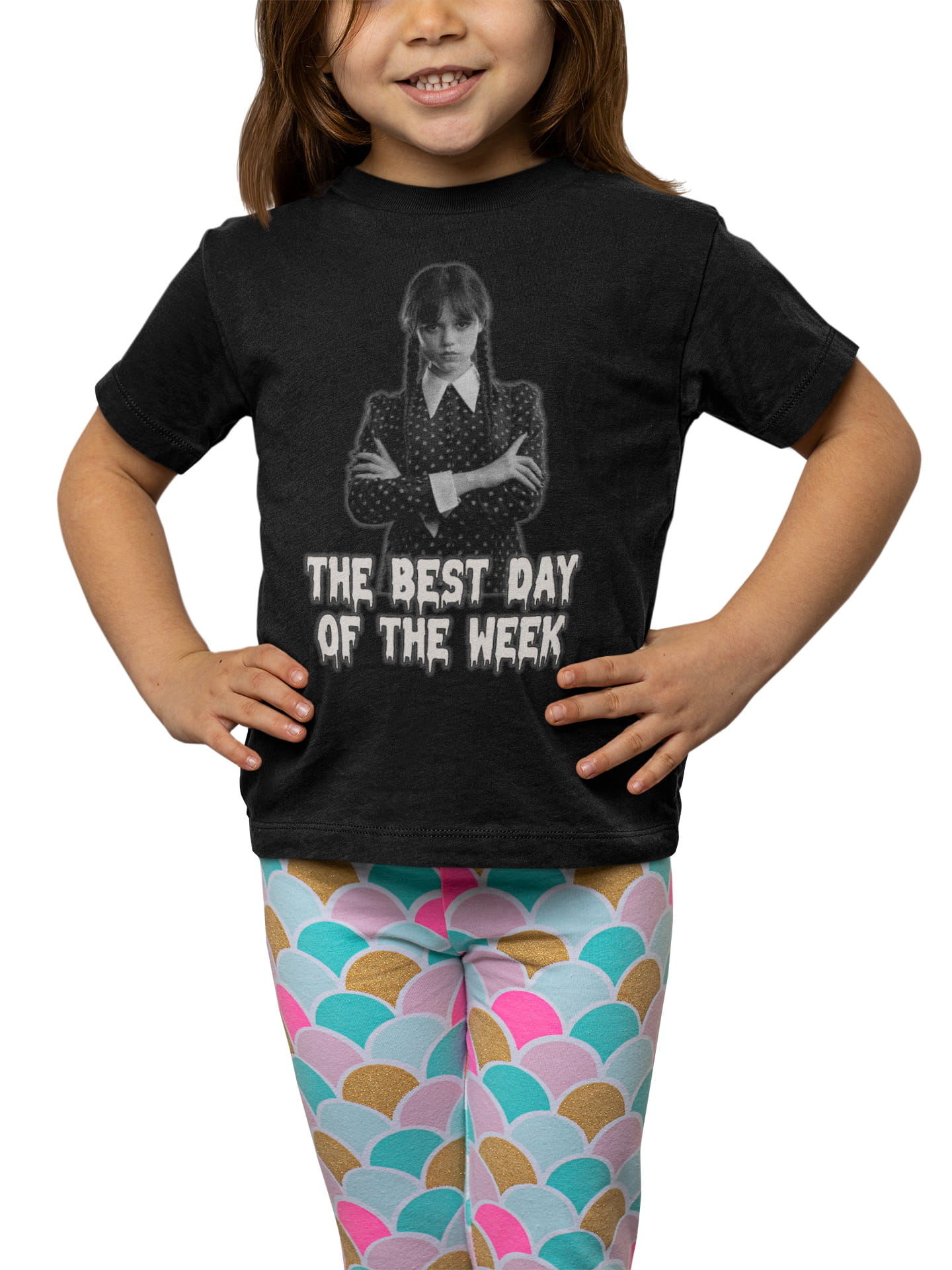 KOSZULKA DZIECIĘCA DLA DZIEWCZYNKI SERIAL NETFLIX WEDNESDAY THE BEST DAY OF THE WEEK MONOCHROM