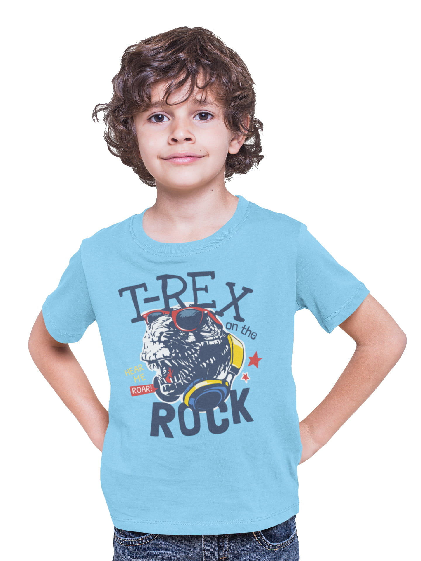 KOSZULKA DZIECIĘCA MUZYCZNA DINOZAUR ZE SŁUCHAWKAMI T-REX ON THE ROCK