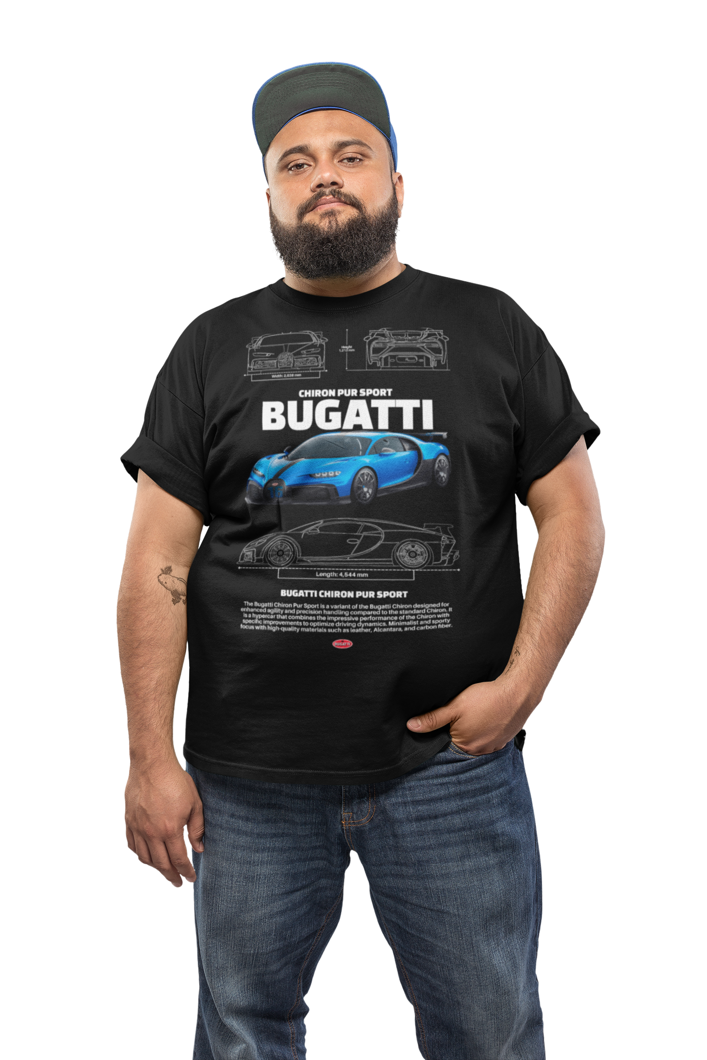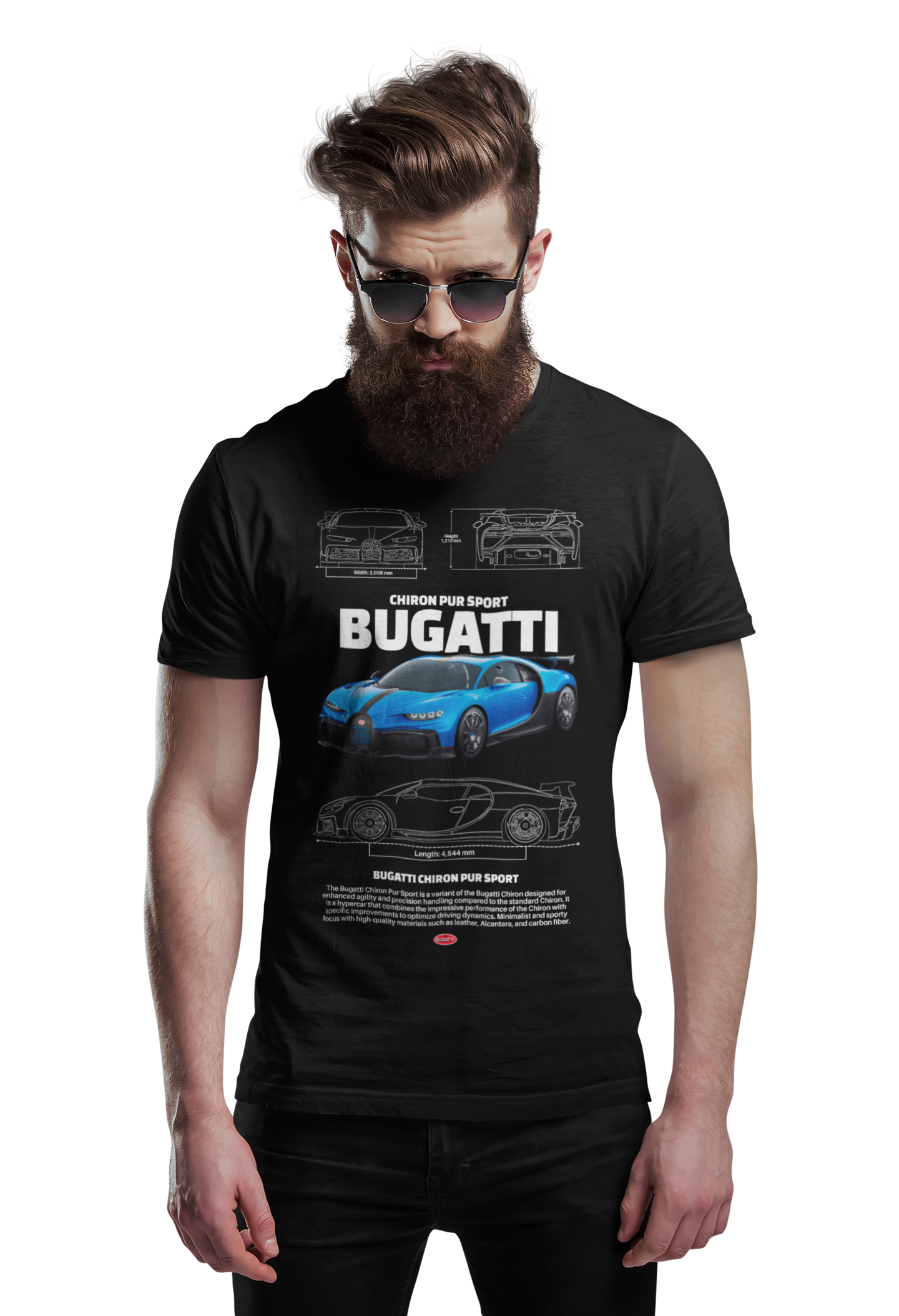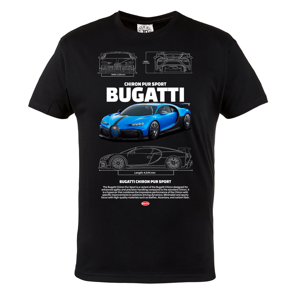 Wyjątkowa męska koszulka z nadrukiem legendarnego Bugatti Chiron Pur Sport to obowiązkowa pozycja dla prawdziwych fanów motoryzacyjnych arcydzieł. Wykonana z wysokiej jakości materiałów, z trwałym i szczegółowym nadrukiem, nie tylko zachwyca stylowym wyglądem świetnie oddając charakter supersamochodu, ale także zapewnia niezrównany komfort na co dzień.