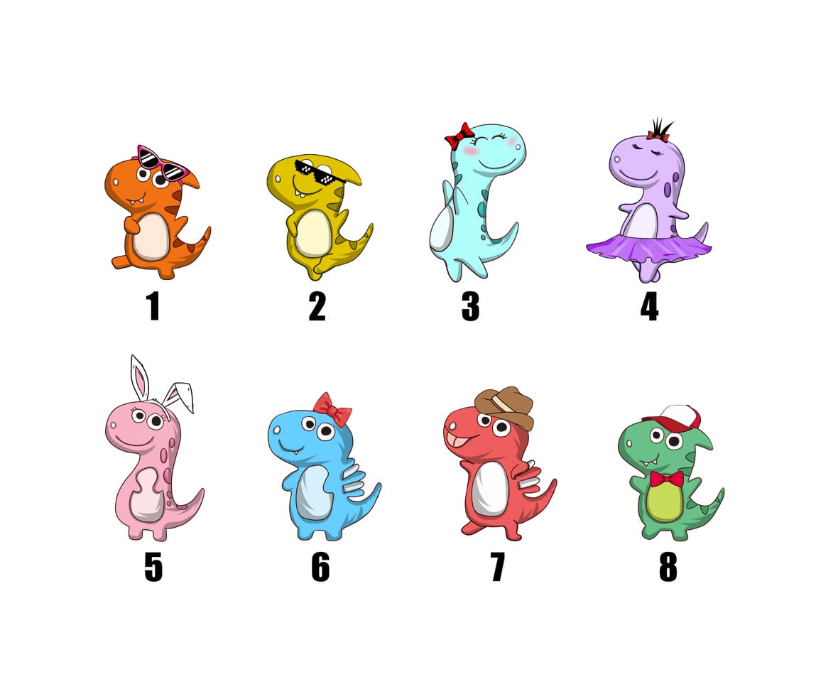 - W uwagach do zamówienia proszę podać wybrany kolor dinozaura dla Taty od A do F oraz proszę podać wybrane dinozaury dla dzieci od 1 do 8. Przy wybranej postaci proszę napisać imię dziecka.