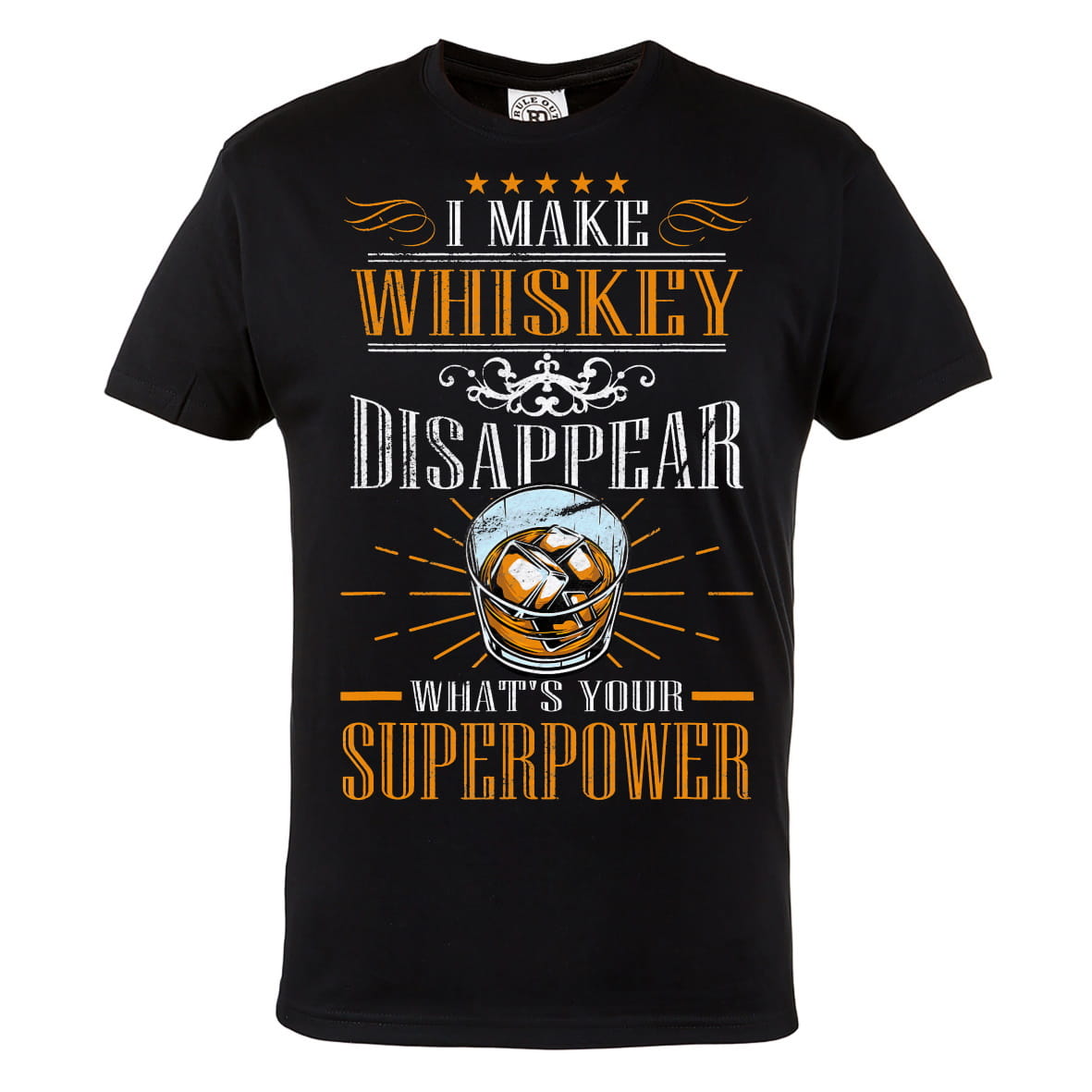 KOSZULKA MĘSKA Z ZABAWNYM NADRUKIEM WHISKY Z LODEM I MAKE WHISKEY DISAPPEAR WHAT'S YOUR SUPERPOWER