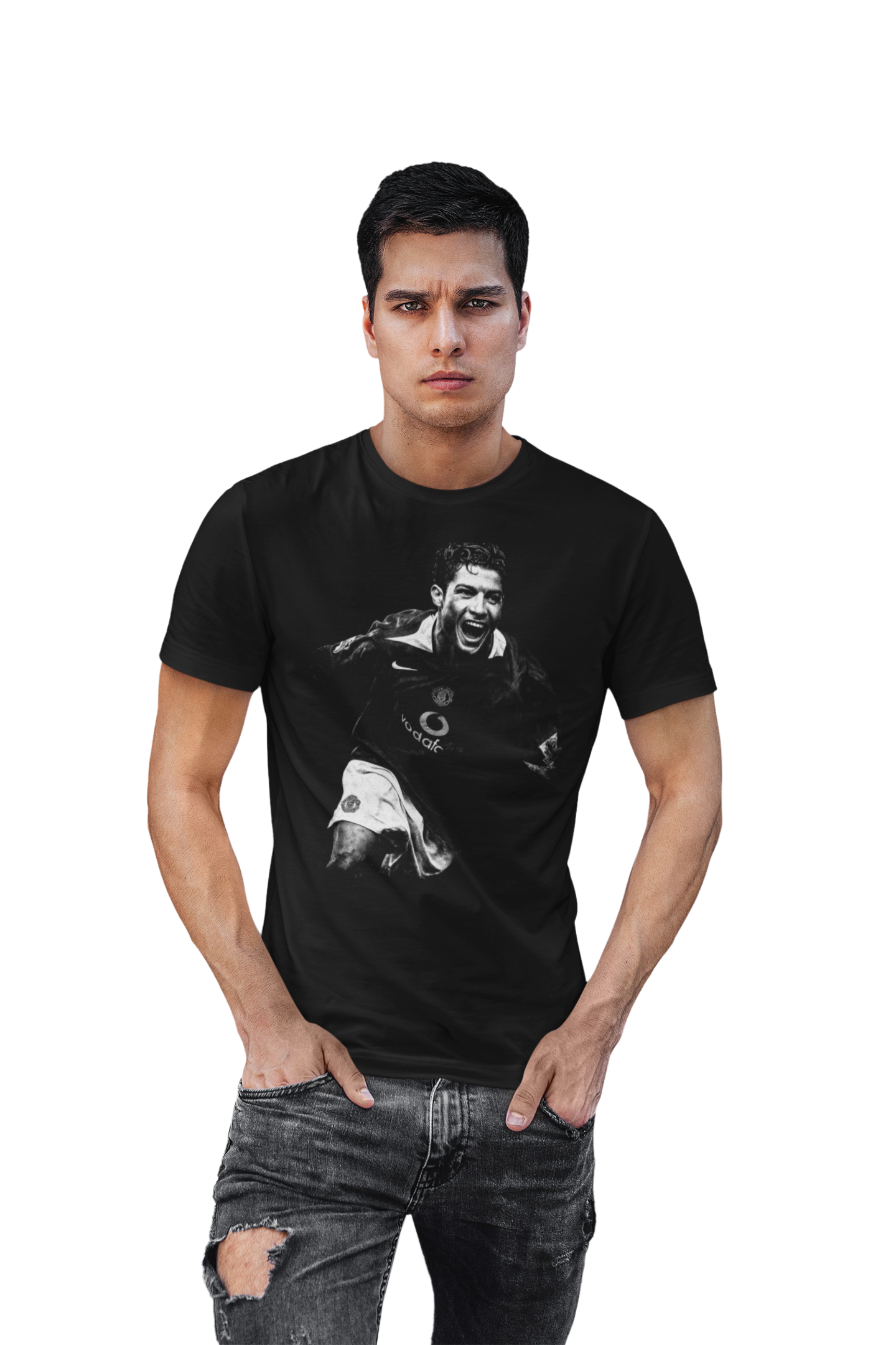 Wyrazisty, artystyczny nadruk oddaje dynamikę i charyzmę Cristiano Ronaldo, podkreślając jego wyjątkowy status w świecie futbolu. Uniwersalny design sprawia, że koszulka świetnie pasuje zarówno do codziennych stylizacji, jak i sportowego lub streetwearowego looku.