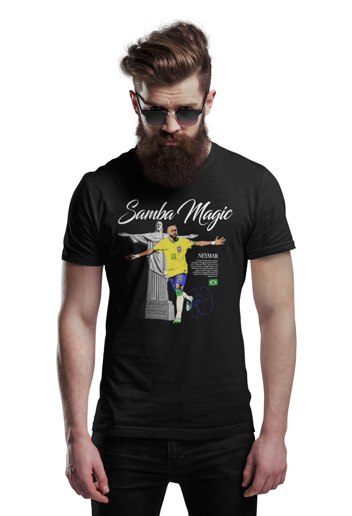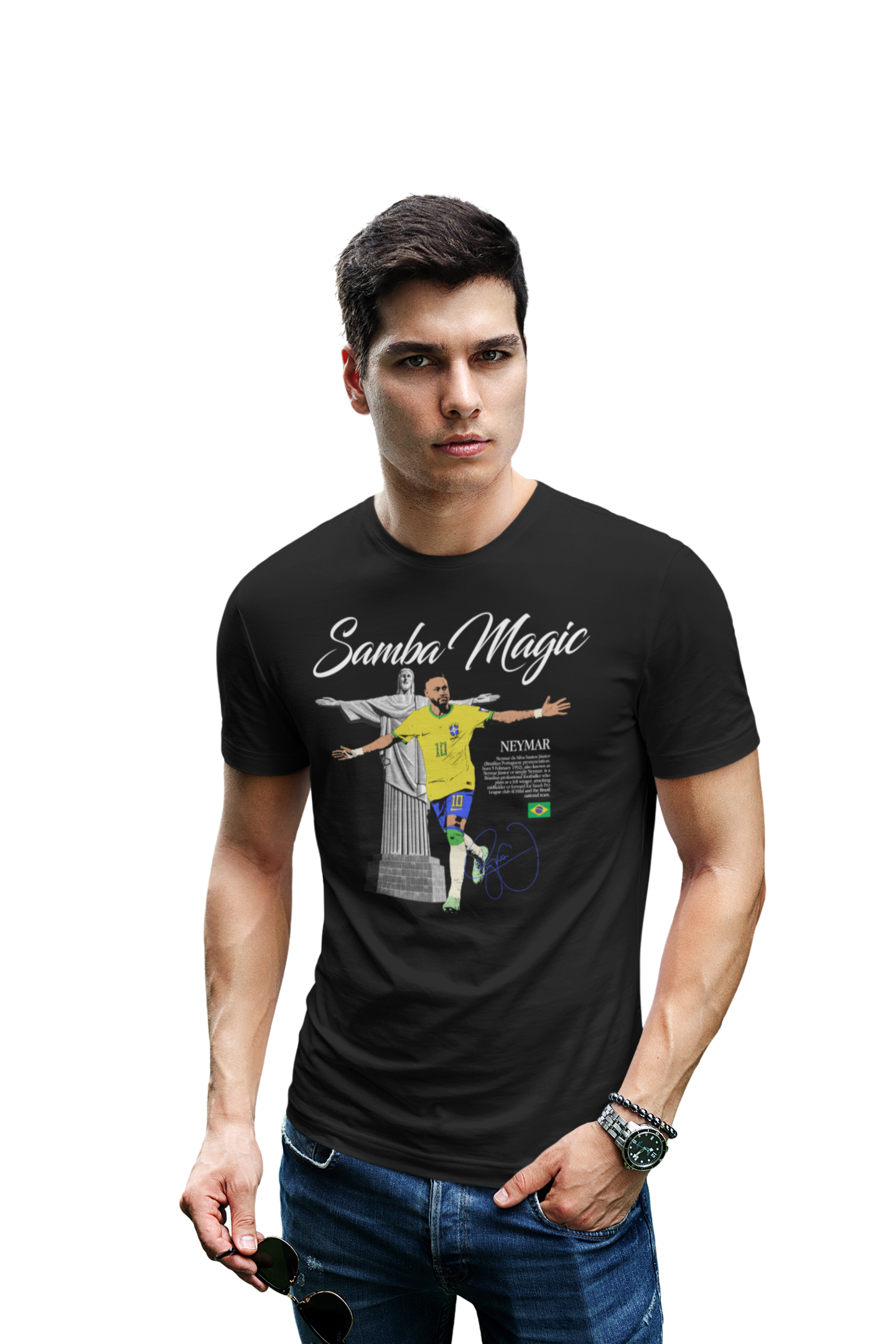 Ta stylowa koszulka męska inspirowana postacią Neymara to hołd dla brazylijskiej magii futbolu, kreatywności i niepowtarzalnego stylu gry. Hasło „Samba Magic” idealnie oddaje jego boiskowy charakter – pełen swobody, techniki i radości z gry.