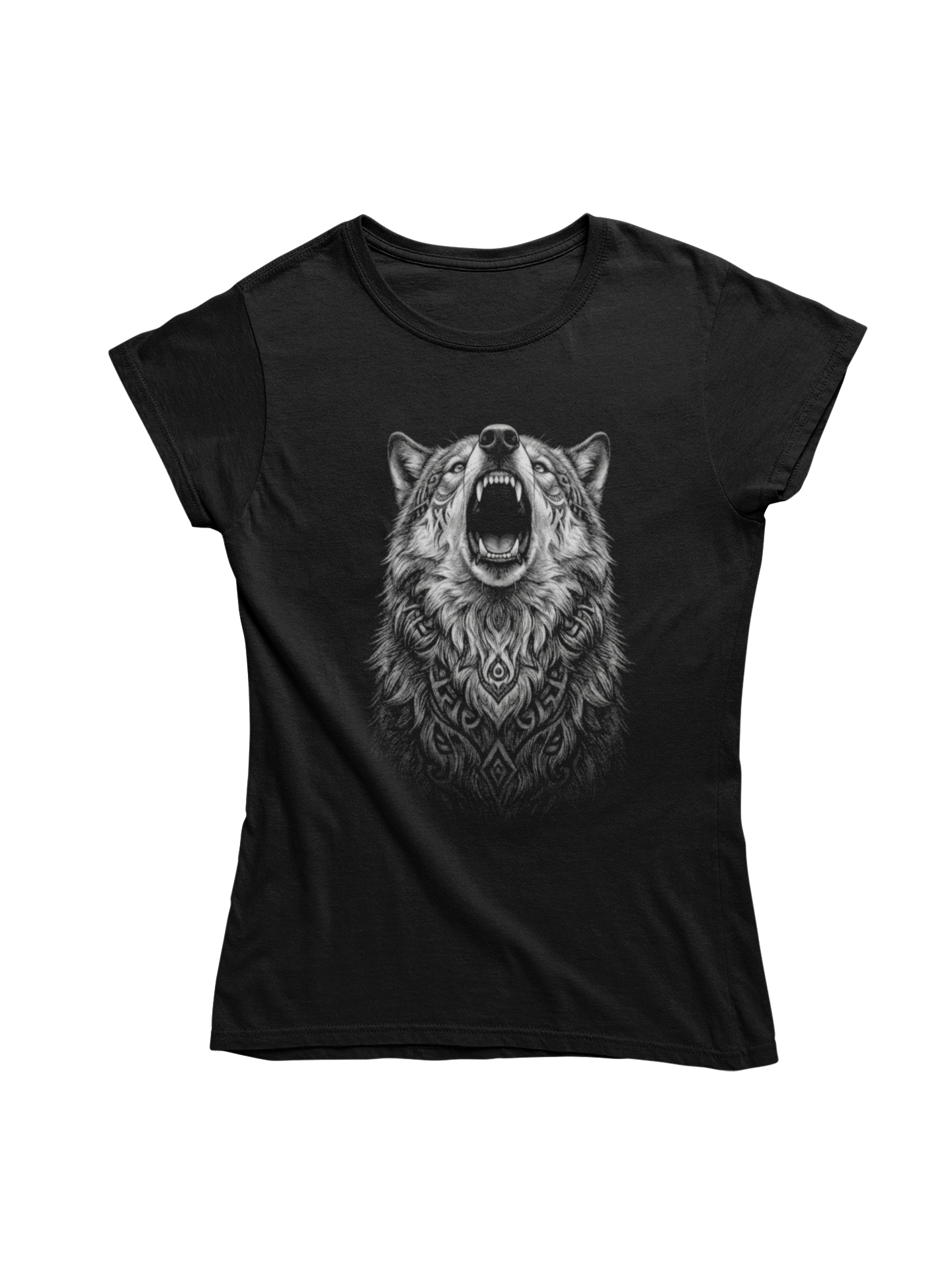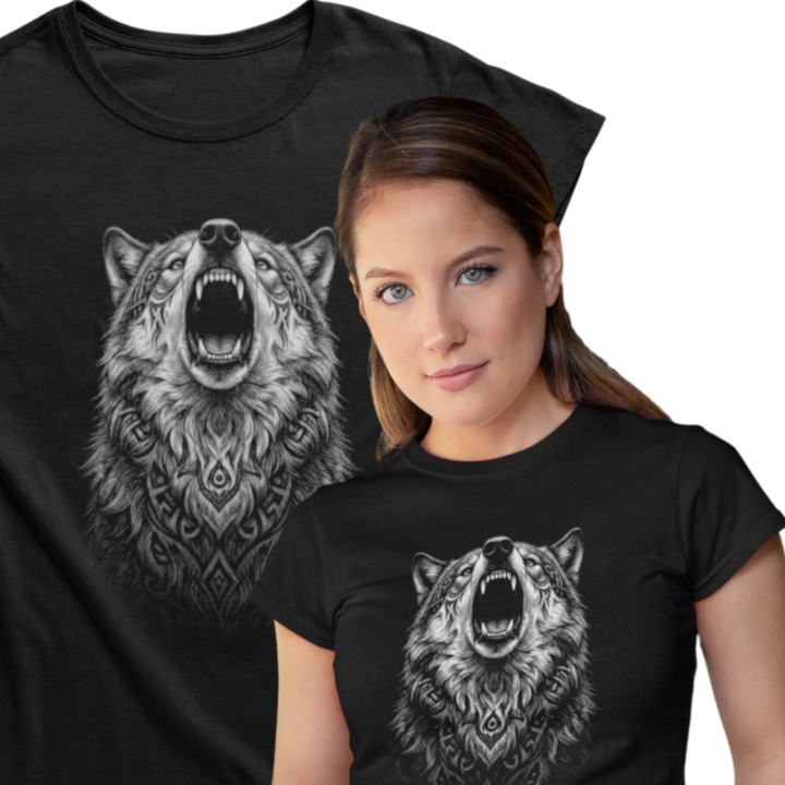 Koszulka damska z nadrukiem wilka to oryginalny t-shirt dla kobiet, które lubią wyraziste motywy inspirowane dziką naturą oraz symboliką siły i wolności. Grafika przedstawiająca wilka z otwartym pyskiem w połączeniu z ozdobnym wzorem przypominającym styl tribal nadaje koszulce drapieżny i charakterystyczny wygląd. Taki motyw przyciąga uwagę i świetnie podkreśla indywidualny styl.