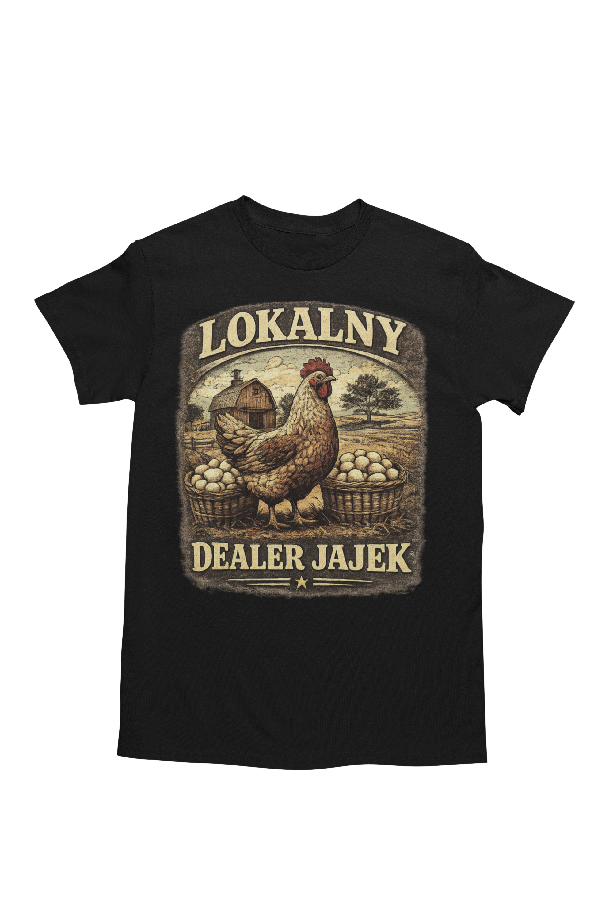 Koszulka męska „Lokalny Dealer Jajek” z realistyczną grafiką kury i wiejskiego krajobrazu to świetna propozycja dla osób związanych z gospodarstwem, hodowlą drobiu oraz klimatem wsi. Nadruk w stylu vintage przedstawiający kurę, jajka oraz elementy wiejskiego krajobrazu nadaje koszulce oryginalny charakter i humorystyczny styl, który z pewnością przyciąga uwagę.
