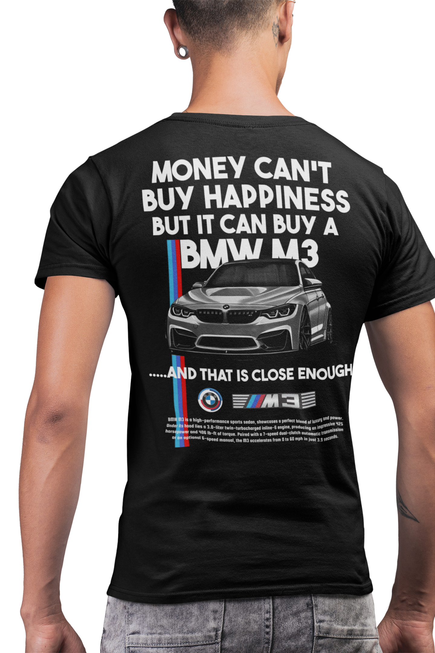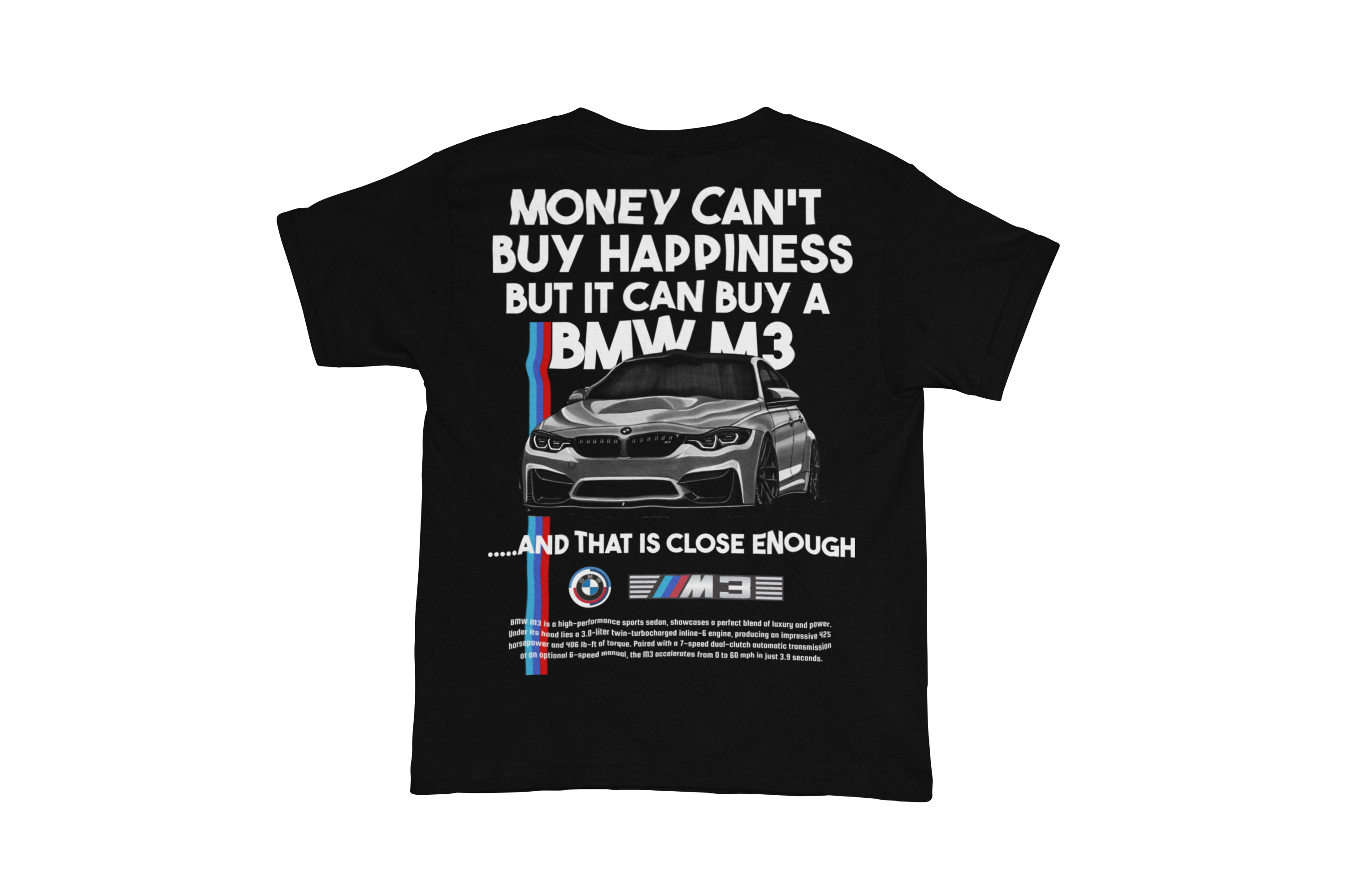 Wyrazista koszulka męska BMW M3 to idealny wybór dla osób, które kochają sportową motoryzację, serię M i mocne sedany. Minimalistyczny przód z logo BMW M3 podkreśla charakter marki, natomiast tył koszulki przyciąga uwagę kultowym hasłem „Money can’t buy happiness, but it can buy a BMW M3” oraz dynamiczną grafiką auta, która jasno komunikuje pasję do osiągów, stylu i emocji za kierownicą. Wysokiej jakości t-shirt BMW M3 wykonany z miękkiej, oddychającej bawełny zapewnia wysoki komfort noszenia zarówno na co dzień, jak i podczas zlotów samochodowych, eventów motoryzacyjnych czy spotkań fanów BMW. Trwały nadruk premium jest odporny na pranie i blaknięcie, dzięki czemu koszulka długo zachowuje estetyczny wygląd. Klasyczny krój męski gwarantuje wygodne dopasowanie, a czarna kolorystyka świetnie pasuje do jeansów i sportowych stylizacji. To doskonały prezent dla fana BMW M3, miłośnika linii M Performance, który chce wyrazić swoją pasję w odważny i stylowy sposób.