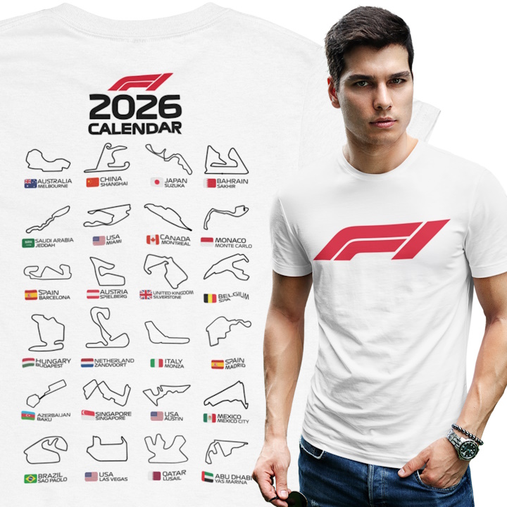 Nowoczesna koszulka męska Formuła 1 2026 to idealny wybór dla miłośników wyścigów F1, motorsportu i torów wyścigowych z całego świata. Biały t-shirt F1 wyróżnia się efektownym nadrukiem kalendarza torów Formuły 1 2026 (Circuits) umieszczonym na plecach oraz minimalistycznym, sportowym motywem z przodu, co nadaje koszulce dynamiczny i nowoczesny charakter. Wykonana z wysokiej jakości, miękkiej i oddychającej bawełny, zapewnia komfort noszenia przez cały dzień, niezależnie czy noszona jest na co dzień, podczas oglądania wyścigów, eventów sportowych czy spotkań z innymi fanami F1. Trwały nadruk premium jest odporny na pranie, ścieranie i blaknięcie, dzięki czemu koszulka zachowuje estetyczny wygląd przez długi czas. Klasyczny krój męski gwarantuje wygodę i uniwersalne dopasowanie, a jasny kolor sprawia, że koszulka świetnie komponuje się z jeansami, spodniami sportowymi oraz szortami. To doskonały prezent dla fana Formuły 1, pasjonata motoryzacji, prędkości i światowych torów wyścigowych.