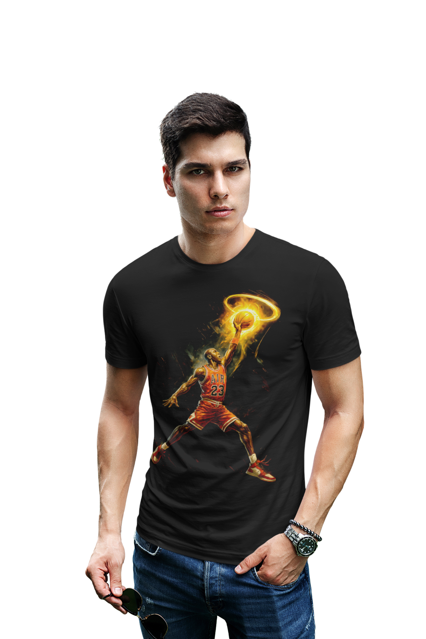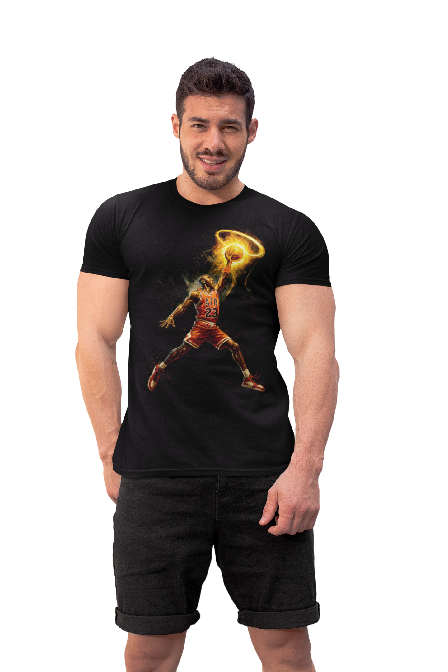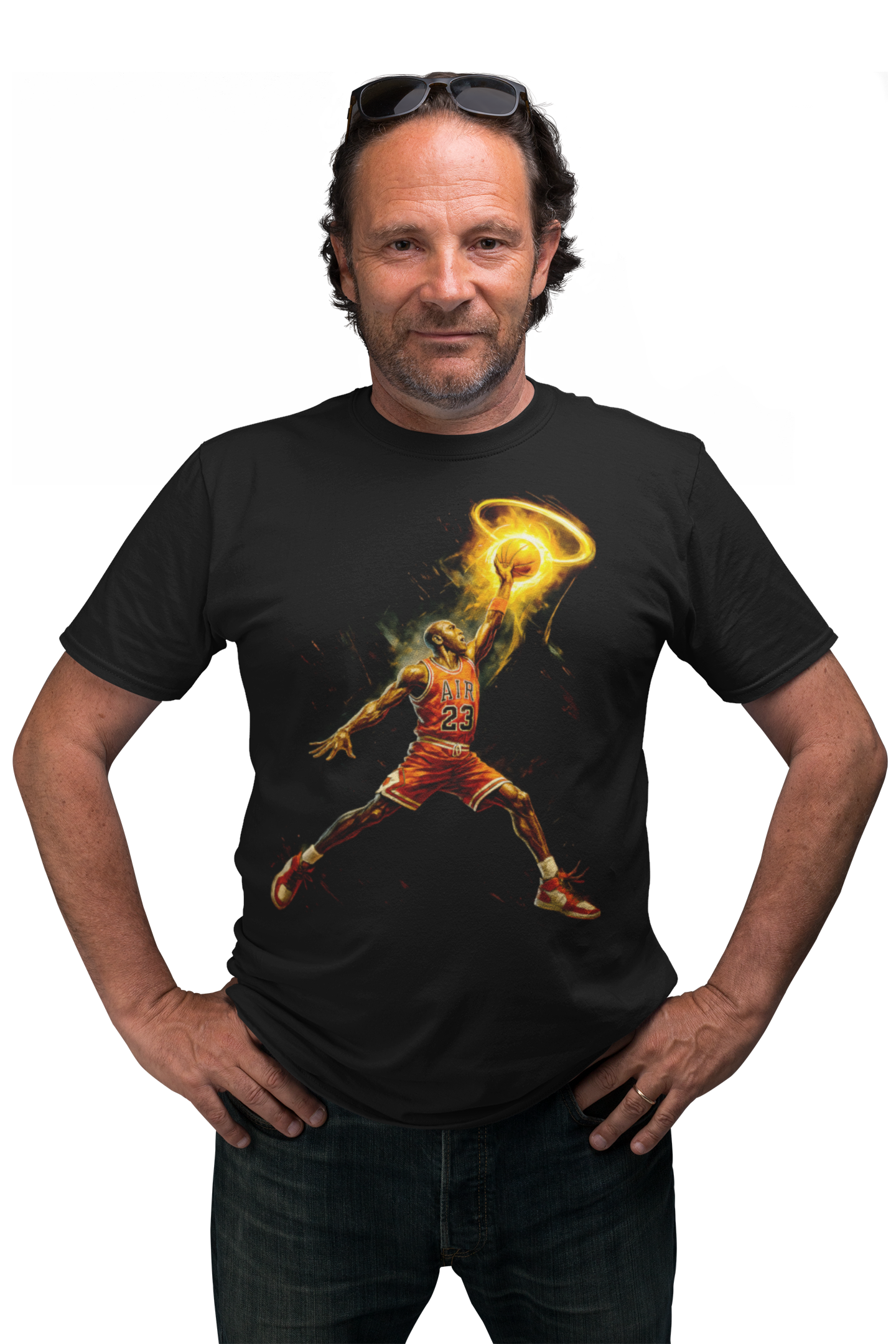 Ta męska koszulka koszykarska inspirowana Michaelem Jordanem to wyjątkowa propozycja dla fanów ligi NBA, klasycznej koszykówki i legendarnej dynastii Chicago Bulls. Efektowny nadruk przedstawia Michaela Jordana w kilku ikonicznych ujęciach meczowych – w ataku, z piłką oraz w charakterystycznych pozach, które na zawsze zapisały się w historii koszykówki. Kultowy numer 23 oraz barwy Bulls jednoznacznie podkreślają jego status koszykarskiej ikony.