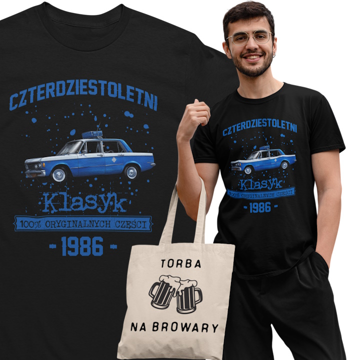 Koszulka prezent na 40 urodziny 1986 Klasyk PRL Fiat 125p torba gratis
