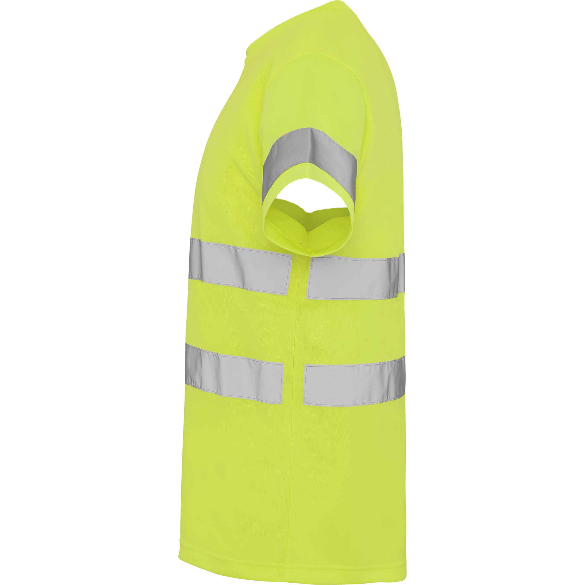 Koszulka wyposażona jest w dwa paski odblaskowe na klatce piersiowej oraz jeden pasek na rękawach, co znacząco poprawia widoczność użytkownika w warunkach ograniczonego oświetlenia.