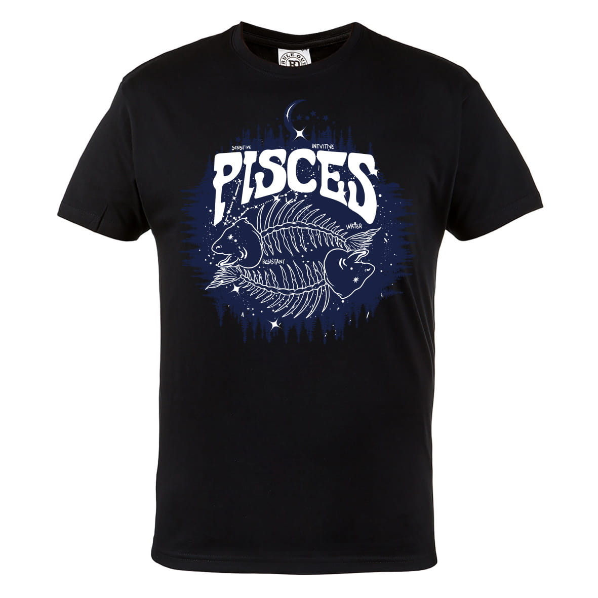 T-shirt dla osób zainteresowanych astrologią - ryby na gwieździstym niebie z cechami charakteru: łagodny.