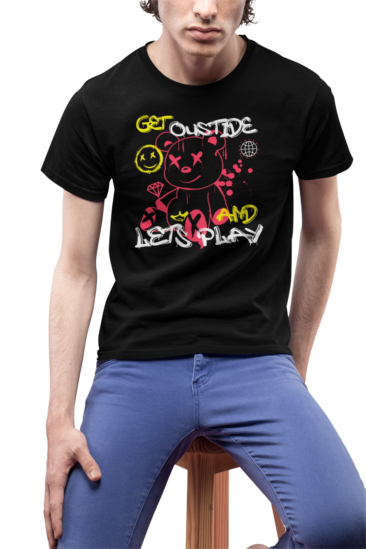 MĘSKA KOSZULKA MOTYWACYJNA PLUSZOWY MIŚ CASUAL GET OUTSIDE AND LETS PLAY THINK POSITIVE