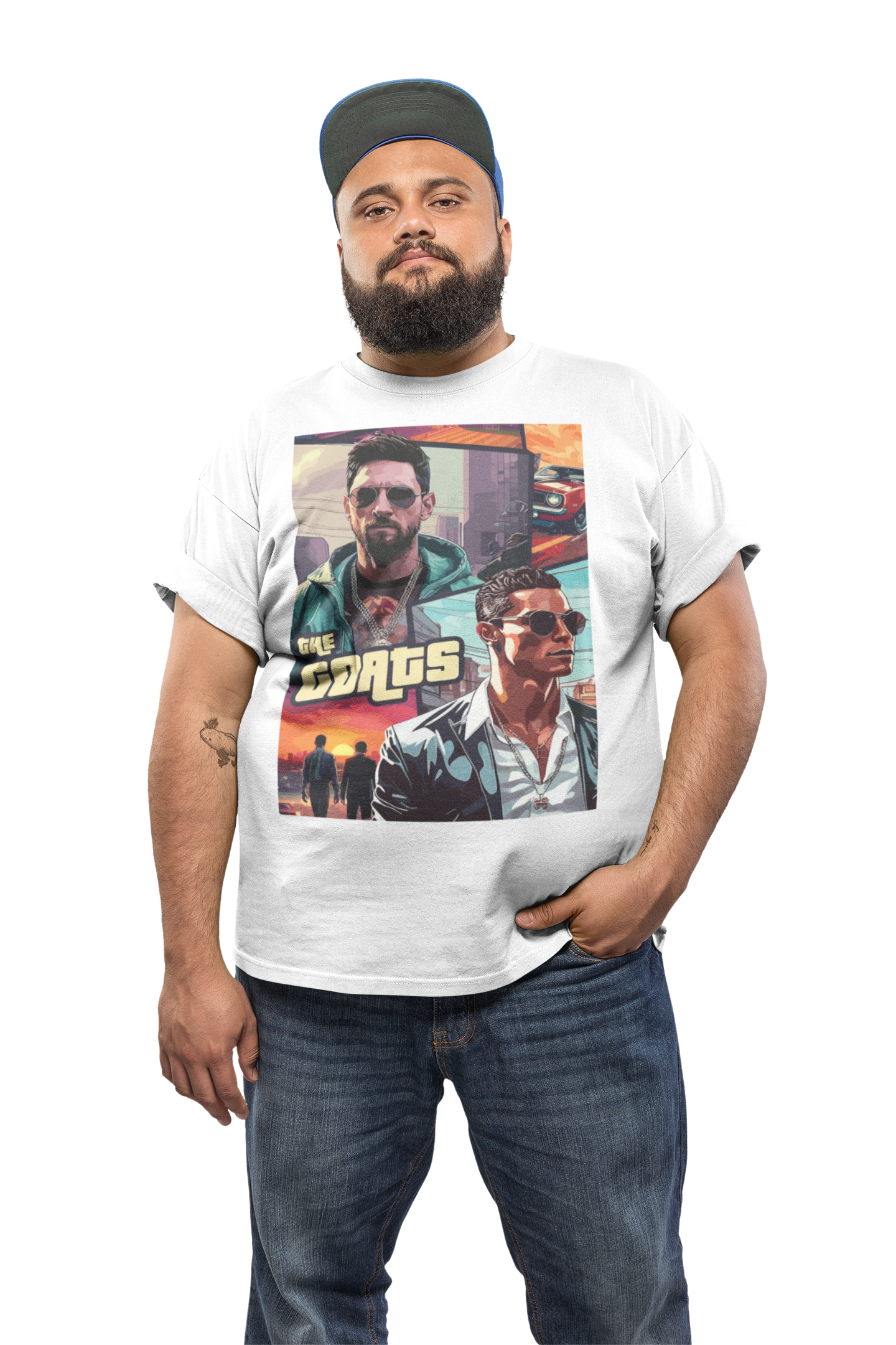 Wyjątkowa koszulka męska z wizerunkami Cristiano Ronaldo i Lionela Messiego to prawdziwy must-have dla każdego fana futbolu! Dwóch największych piłkarzy w historii na jednej koszulce – symbol rywalizacji, pasji i niezrównanego talentu. Wykonana z wysokiej jakości materiałów, zapewnia wygodę i trwałość, a dynamiczny nadruk „THE GOATS” podkreśla legendarny status obu zawodników.