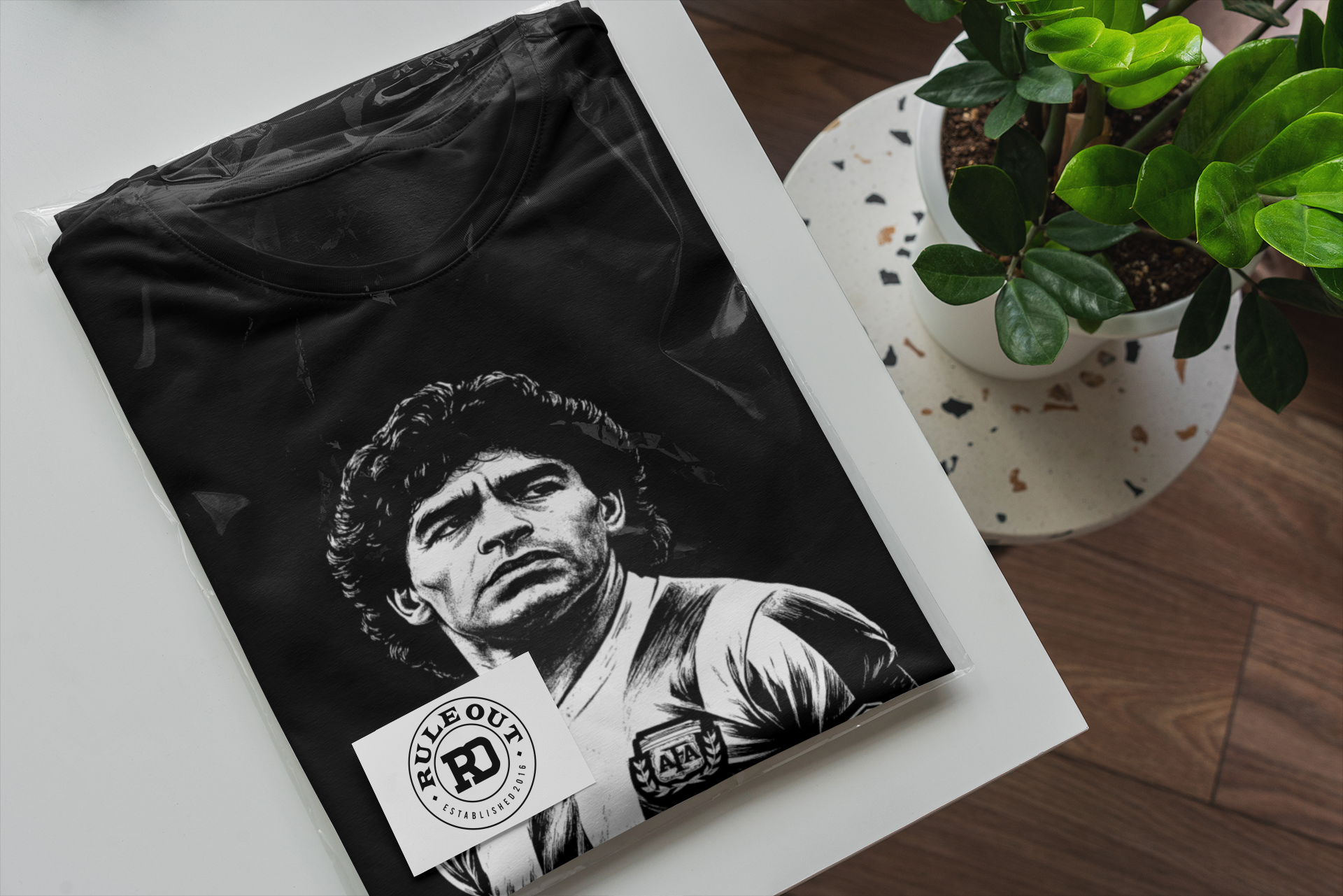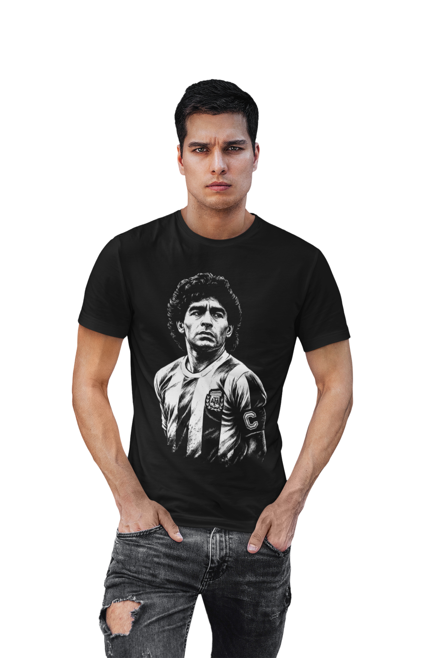 Artystyczny, monochromatyczny nadruk przedstawiający Maradonę w klasycznym, reprezentacyjnym ujęciu doskonale oddaje jego charyzmę, determinację i niepowtarzalny charakter boiskowy. Wyrazista grafika przyciąga wzrok i nadaje koszulce ponadczasowy, legendarny styl.