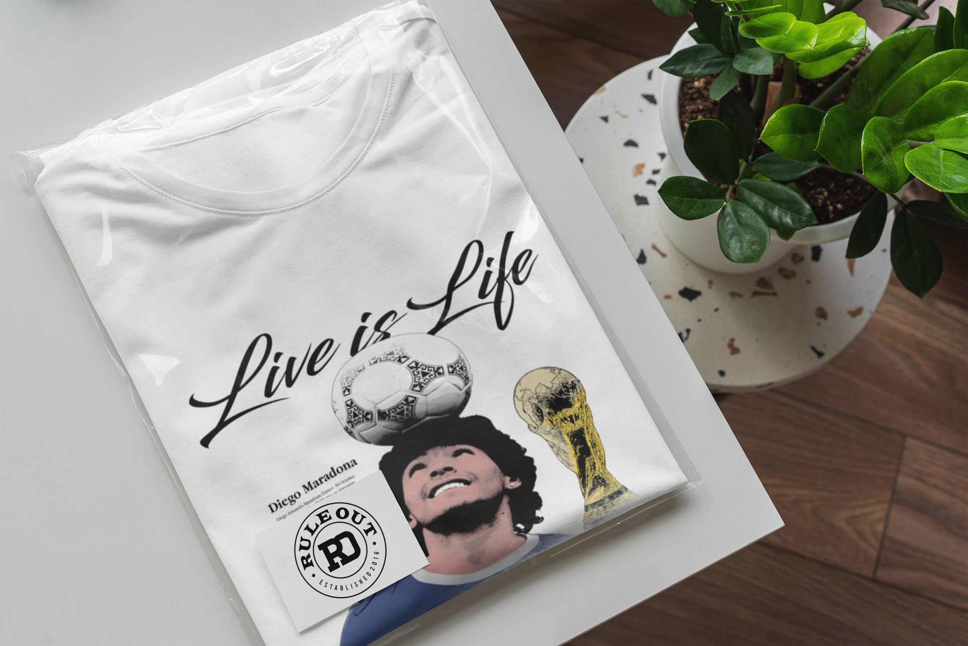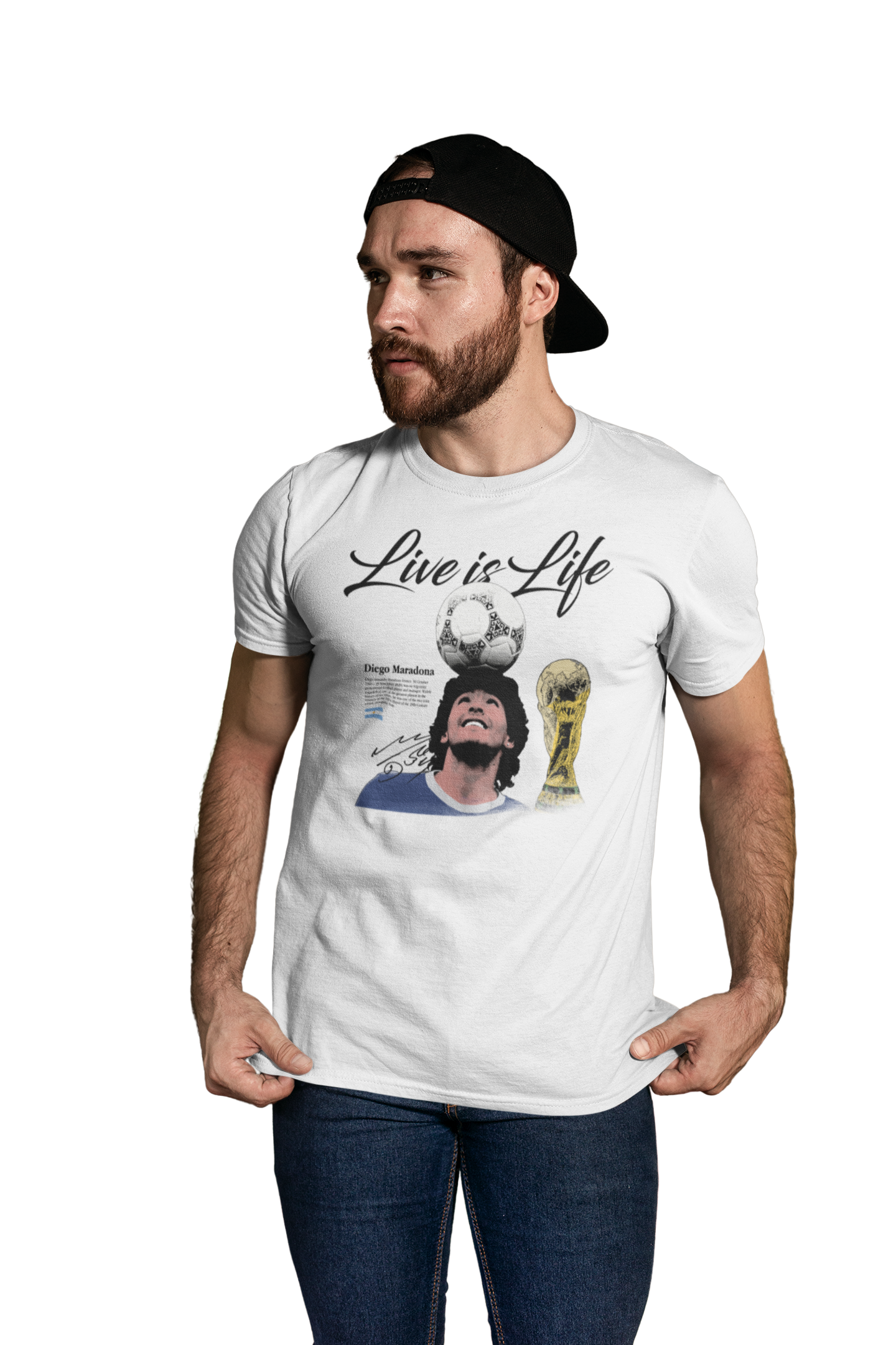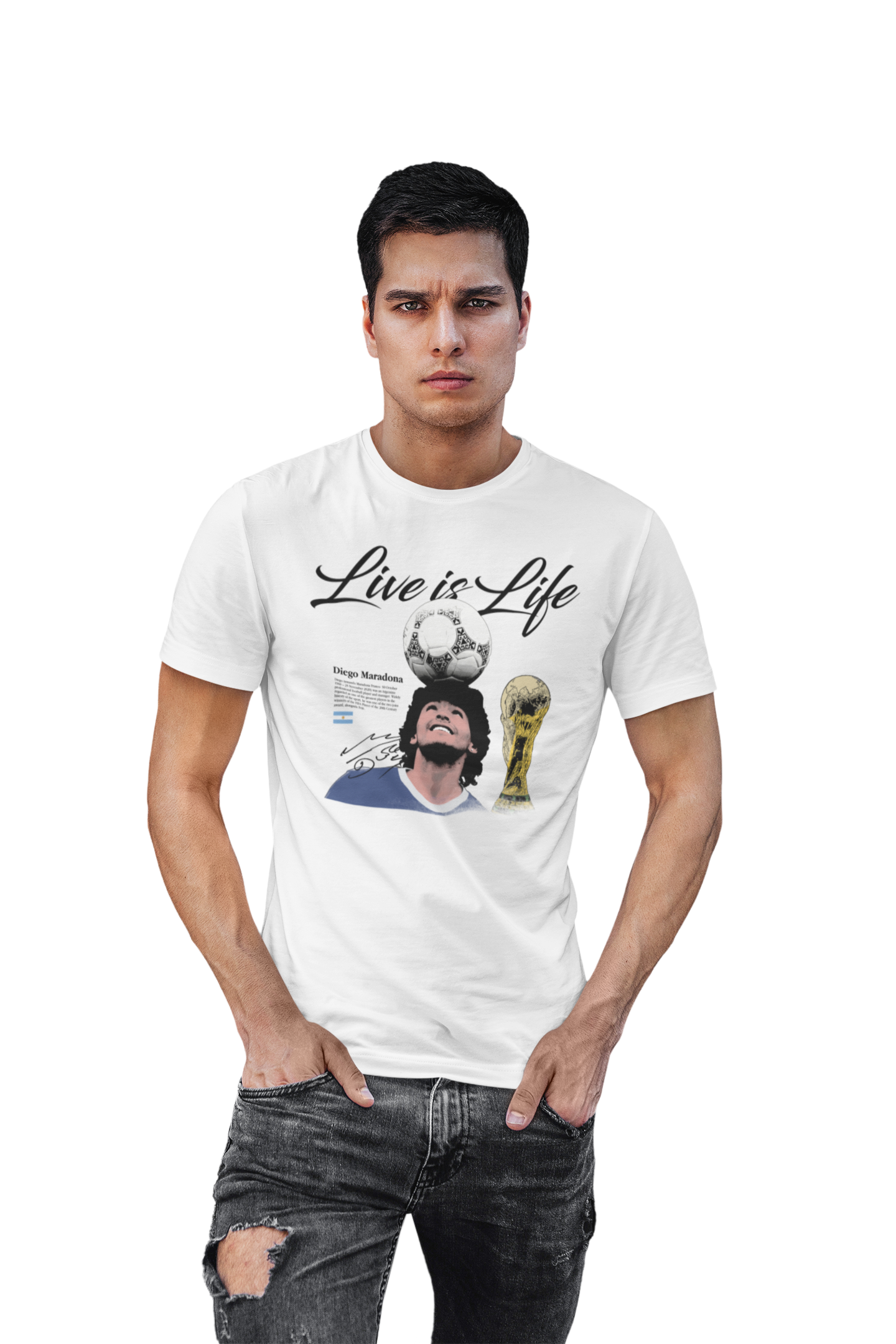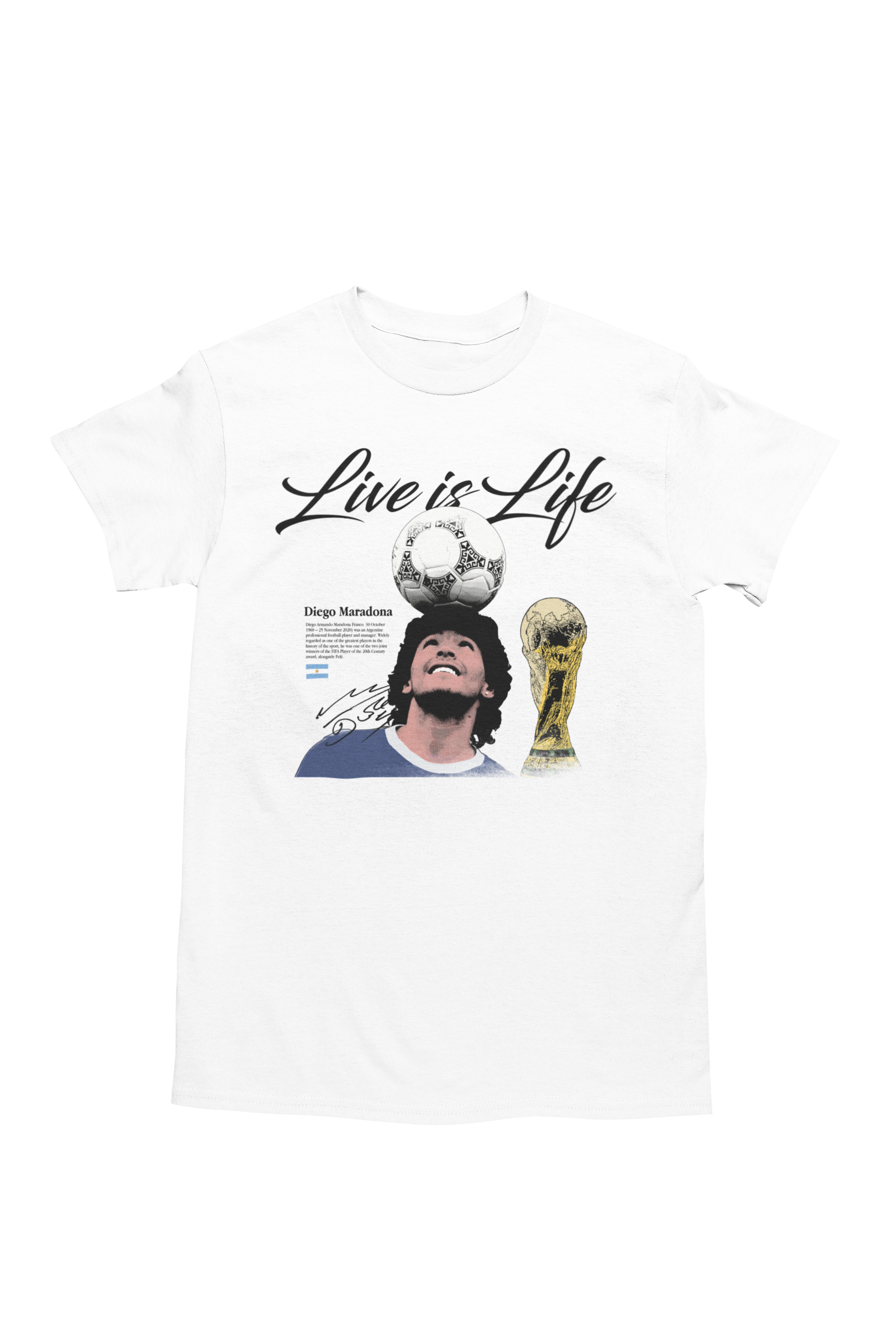 Artystyczny nadruk z hasłem „Live is Life”, kultową sylwetką Maradony balansującego piłkę oraz motywem mistrzowskiego trofeum podkreśla jego legendarny status i miejsce w historii futbolu. Grafika nawiązuje do niezapomnianych momentów, które na zawsze zapisały się w pamięci kibiców na całym świecie.