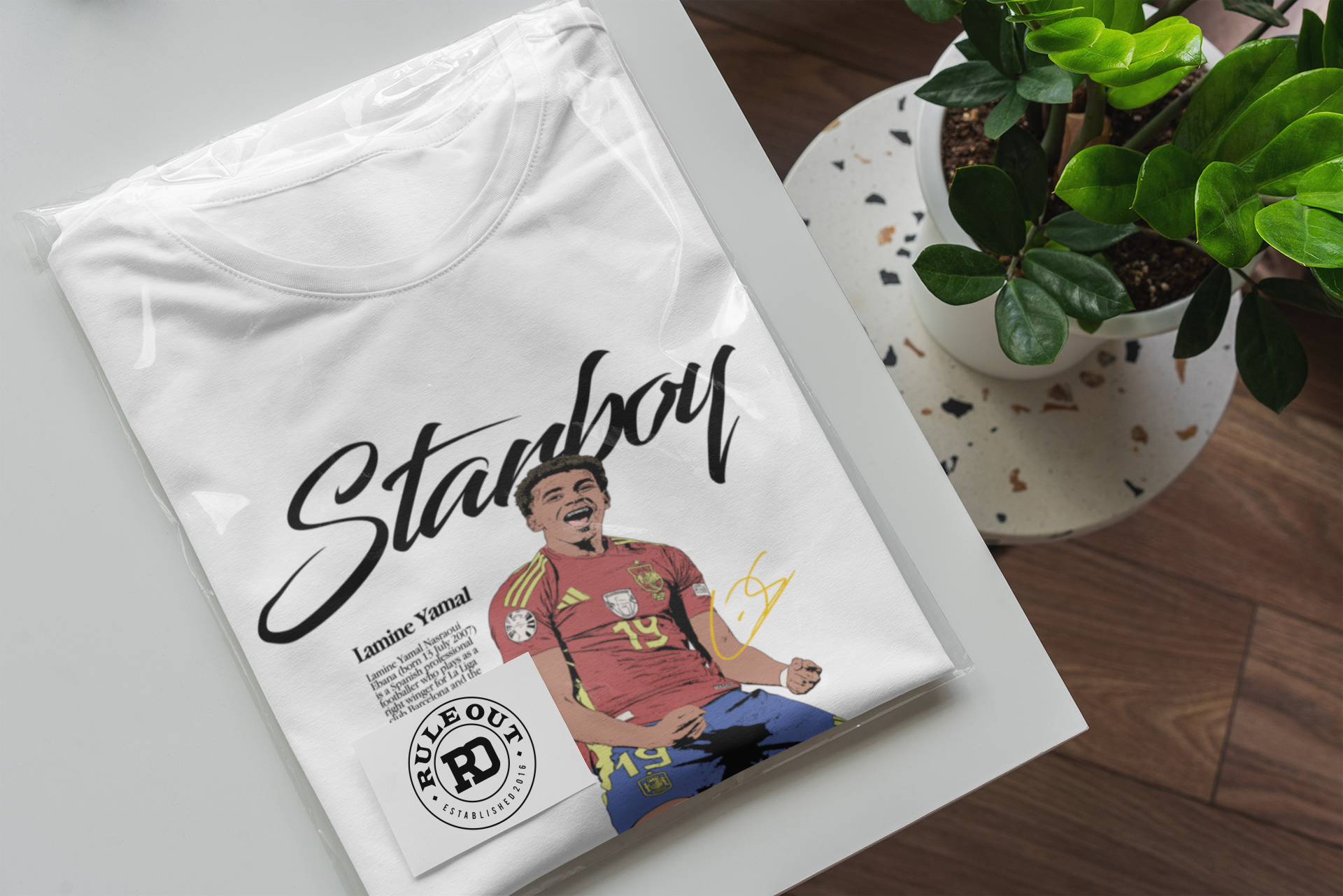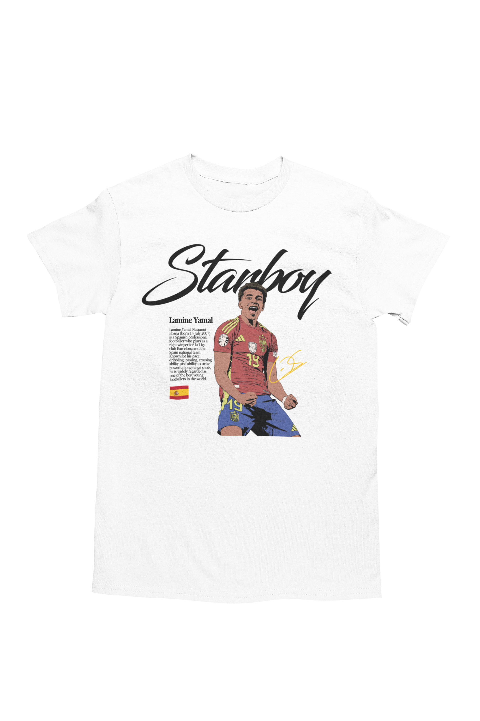 Artystyczny nadruk inspirowany hasłem „Starboy” podkreśla błyskawiczną drogę Yamala na piłkarski szczyt oraz jego status wschodzącej gwiazdy światowego futbolu. Dynamiczna sylwetka i ekspresyjna poza sprawiają, że koszulka przyciąga wzrok i wyróżnia się na tle innych koszulek sportowych.