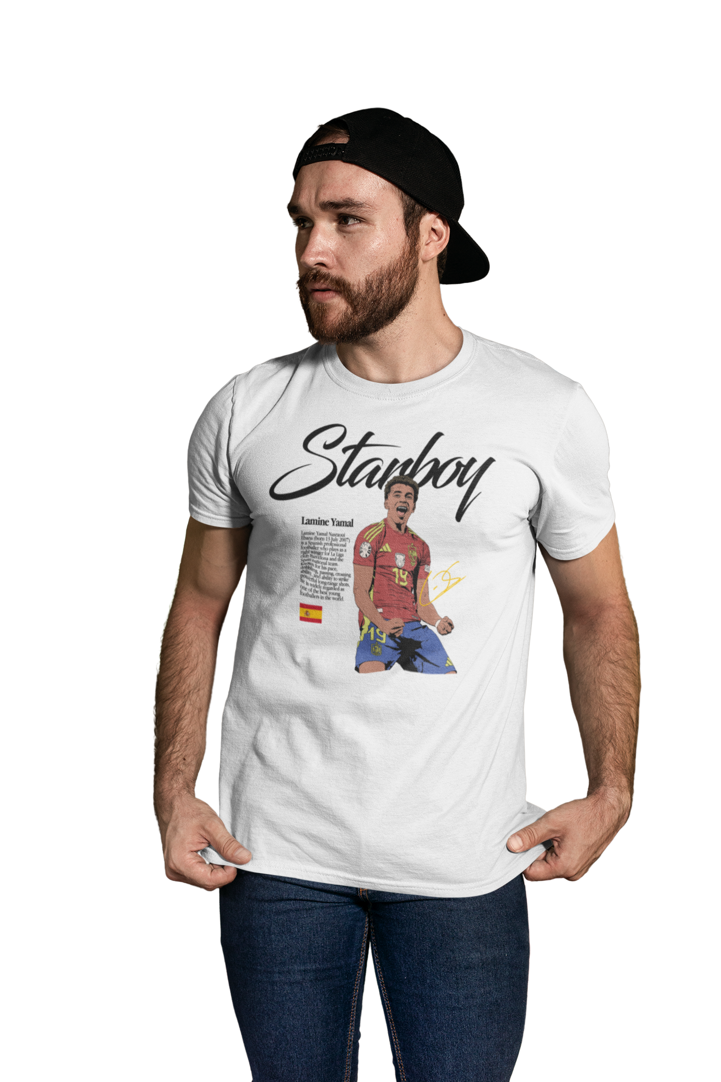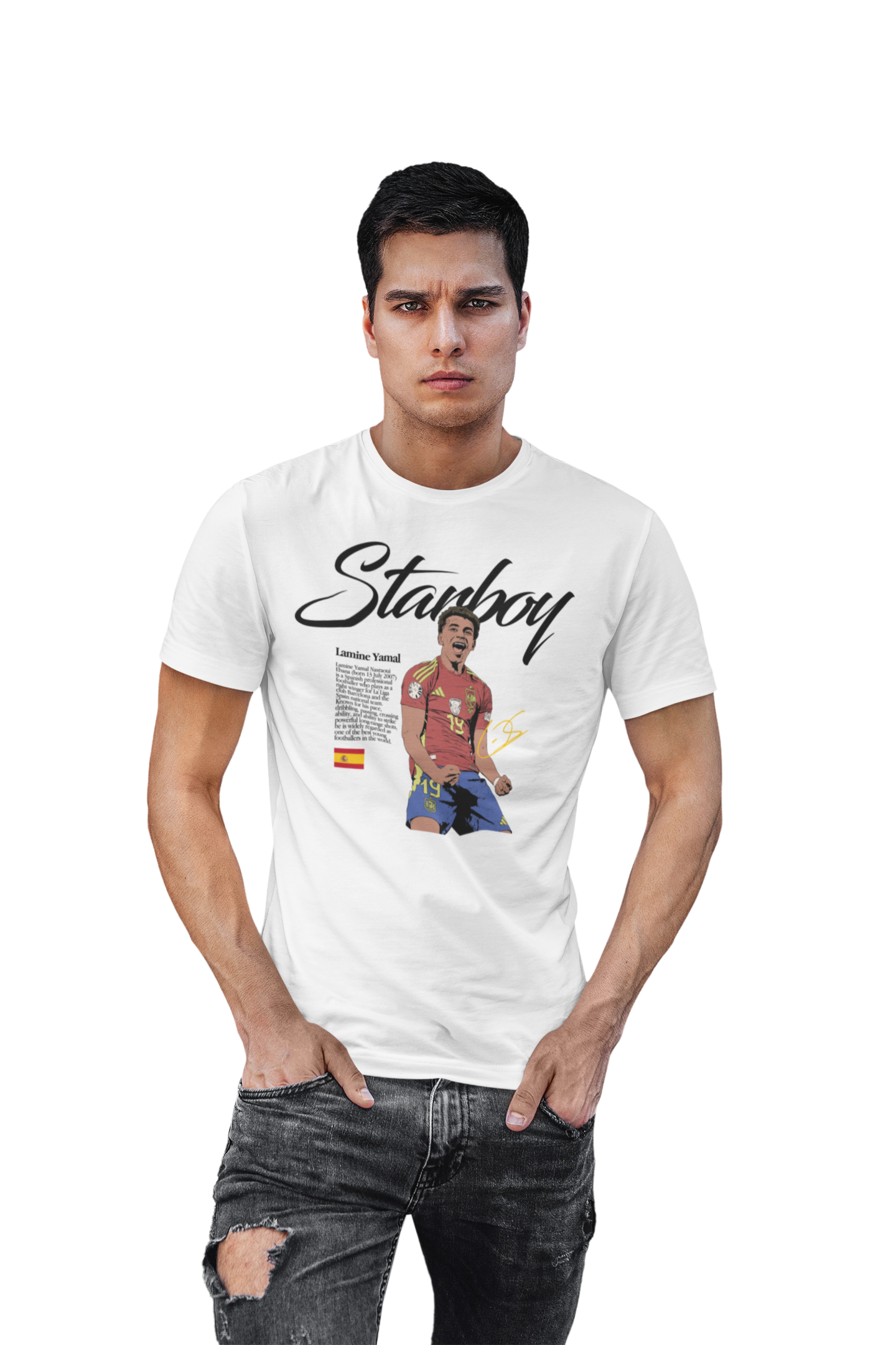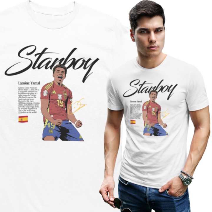 Ta wyjątkowa koszulka męska z wizerunkiem Lamine Yamala to absolutny must-have dla każdego fana nowej generacji futbolu. Jeden z najbardziej utalentowanych młodych piłkarzy na świecie, symbol świeżości, odwagi i ogromnego potencjału – teraz w formie stylowego, kolekcjonerskiego t-shirtu.