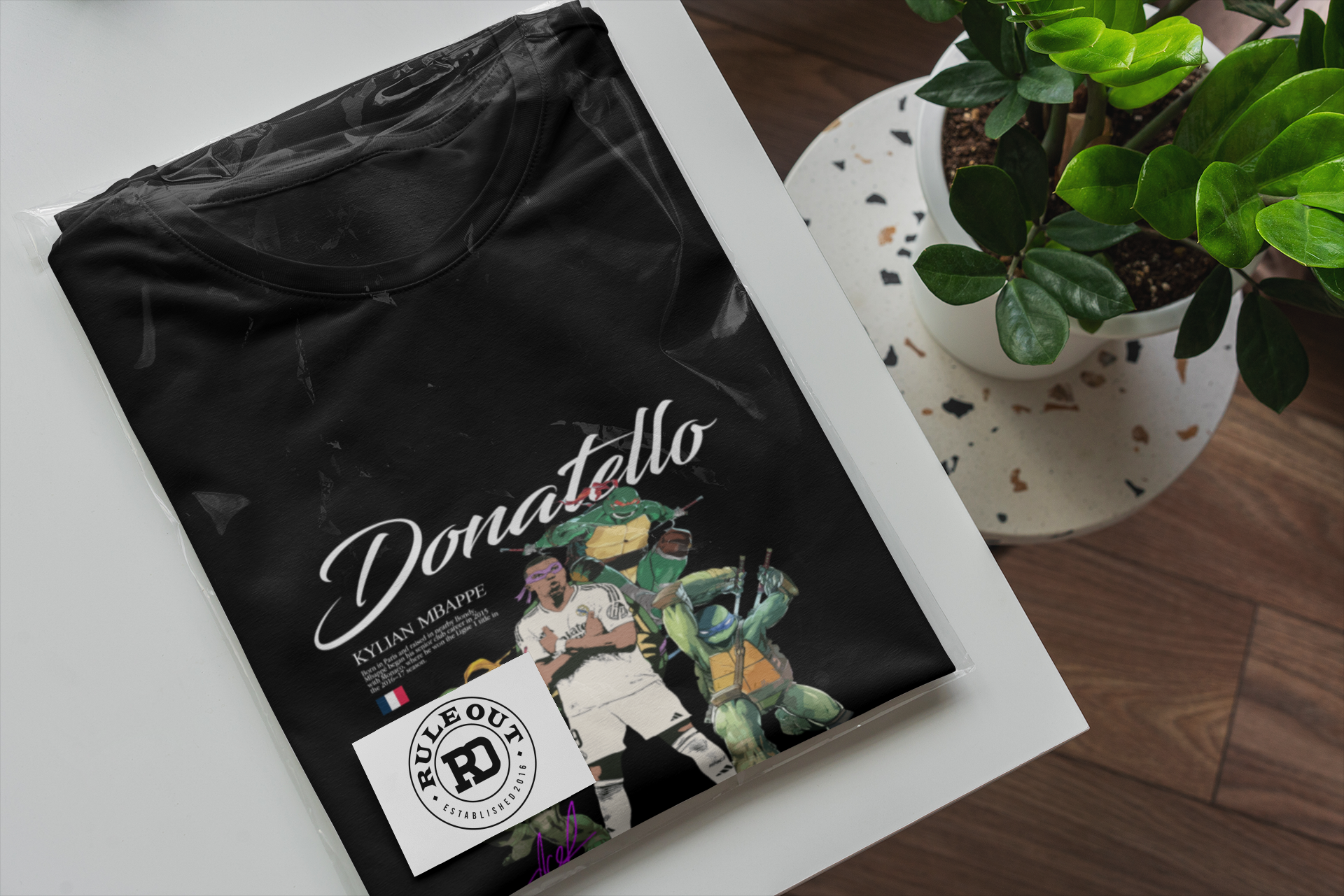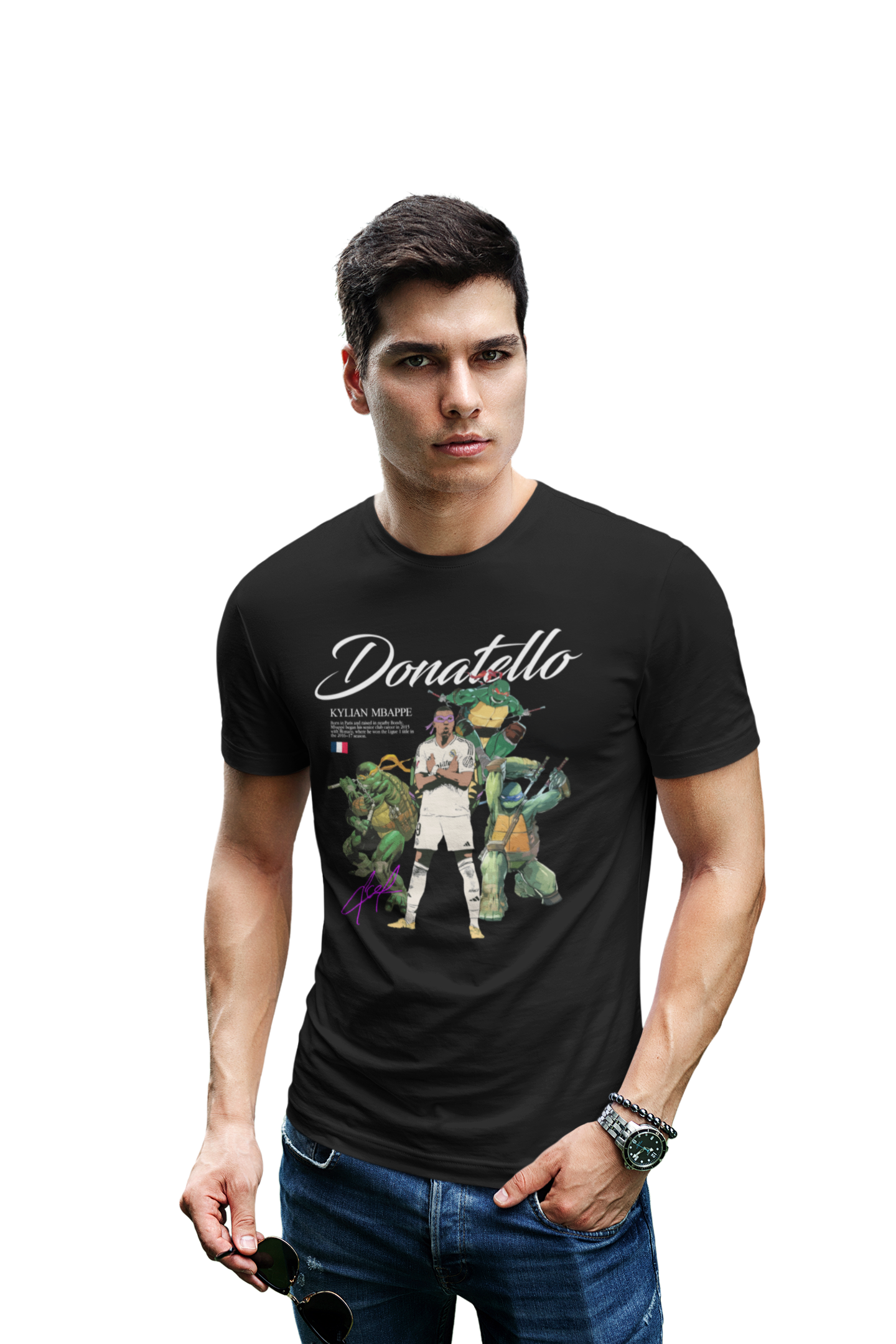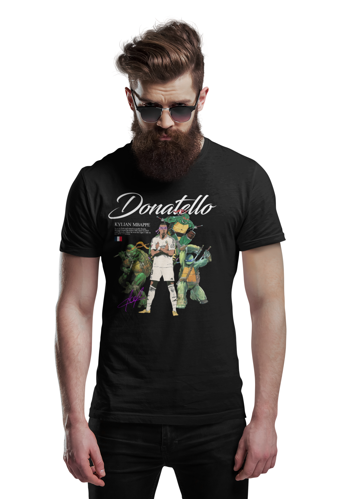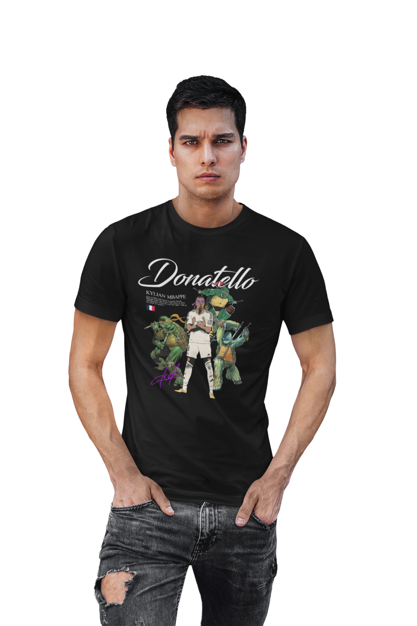 Wyjątkowa czarna koszulka męska inspirowana Kylianem Mbappé w oryginalnym, popkulturowym wydaniu. Motyw „Donatello” nawiązuje do wojowniczego charakteru, szybkości i pewności siebie jednego z najlepszych piłkarzy młodego pokolenia, łącząc świat futbolu z kultową stylistyką streetwearową.