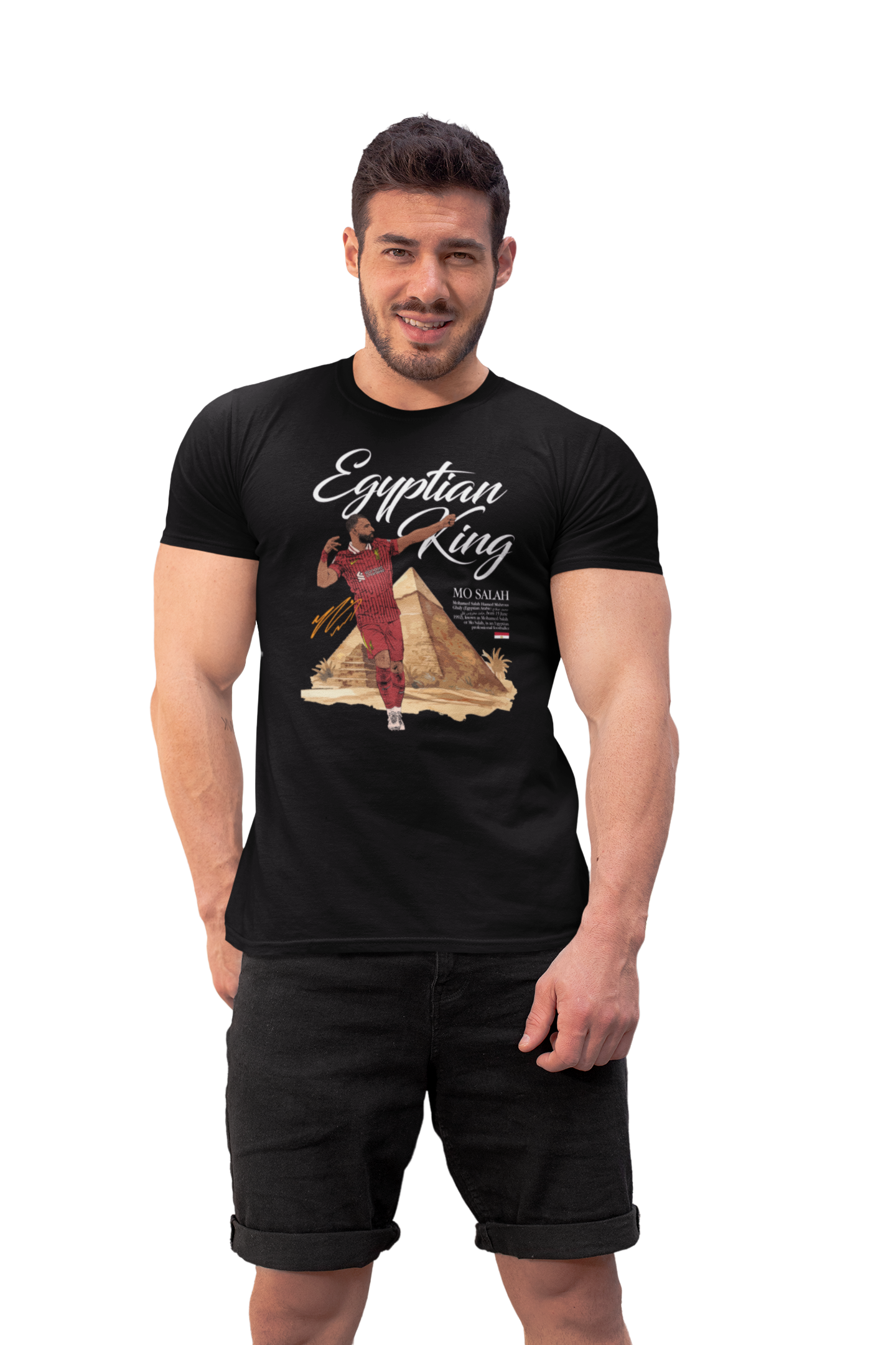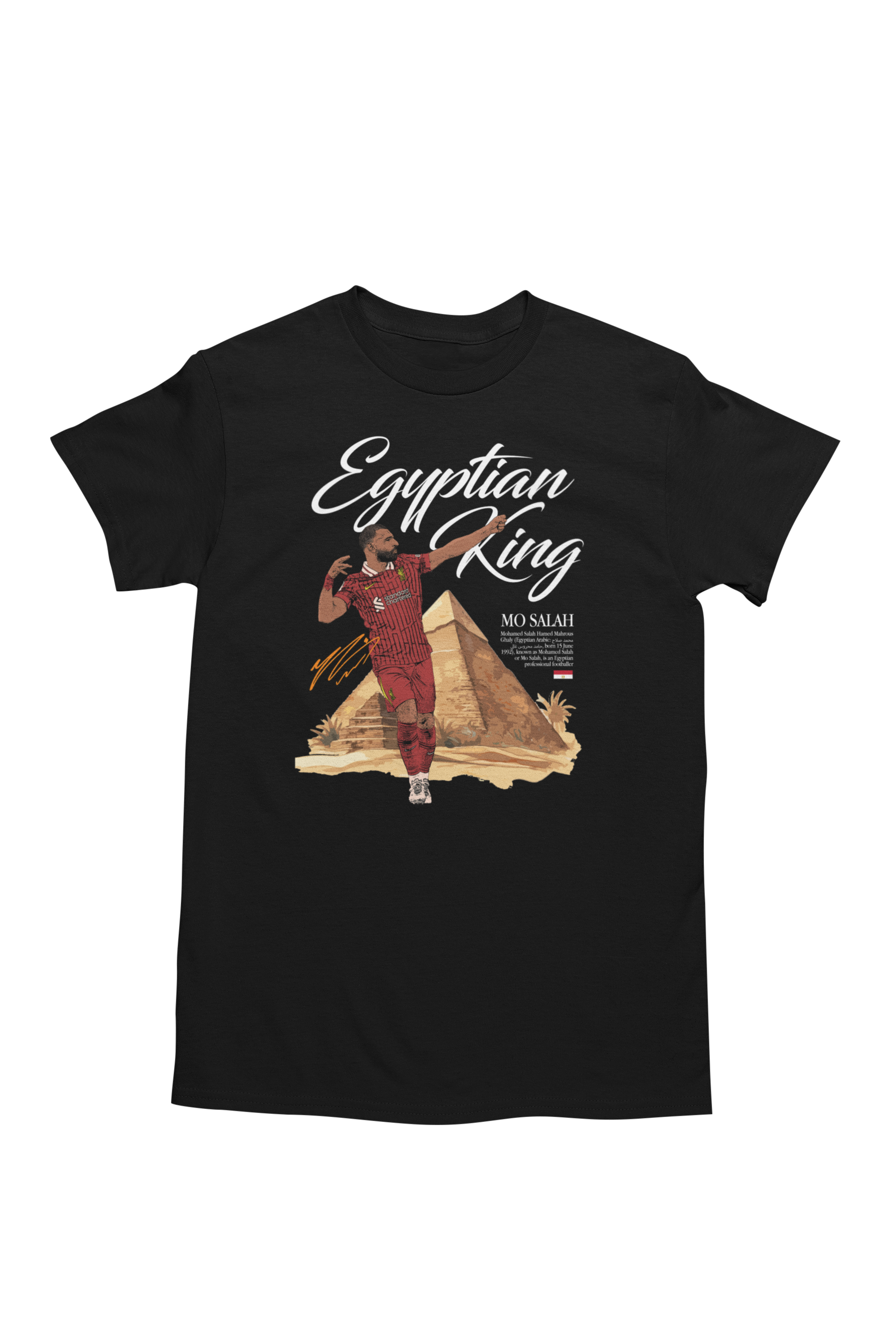 Artystyczny nadruk z hasłem „Egyptian King” oraz motywem piramid doskonale podkreśla pochodzenie i legendarny status zawodnika. Ciemna kolorystyka koszulki nadaje całości mocnego, nowoczesnego charakteru, a kontrastowa grafika sprawia, że nadruk jest wyjątkowo wyrazisty i przyciąga uwagę.