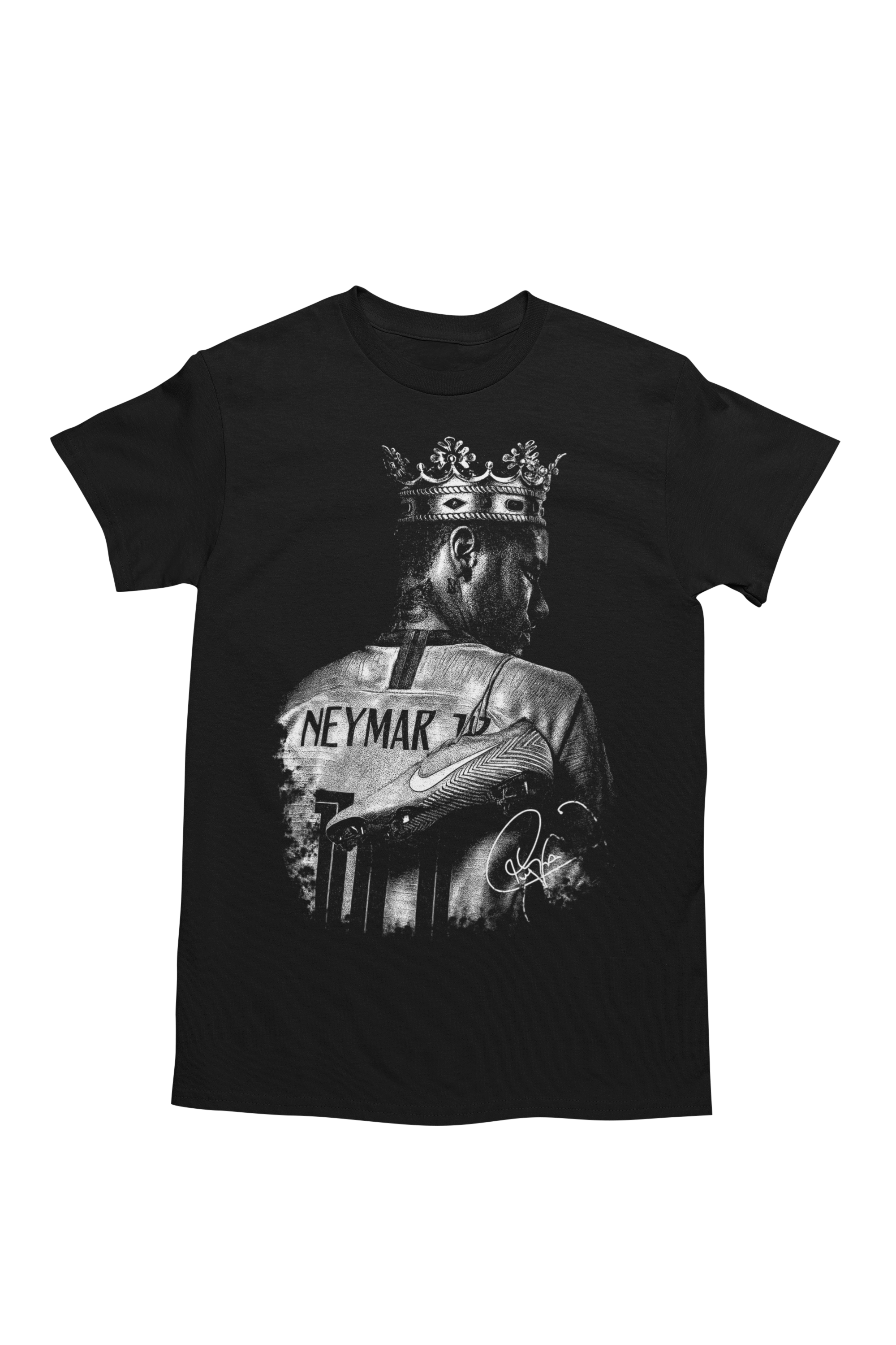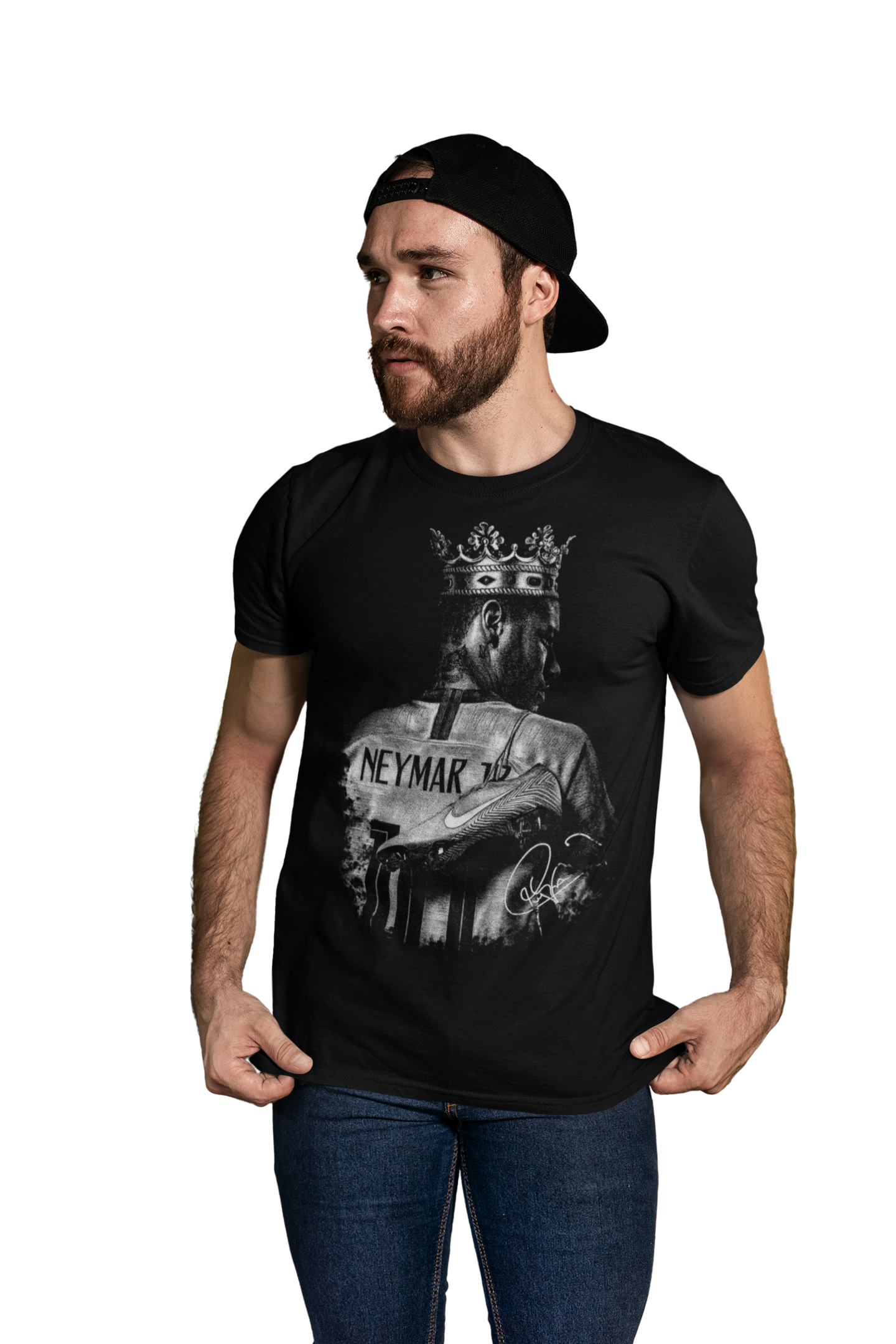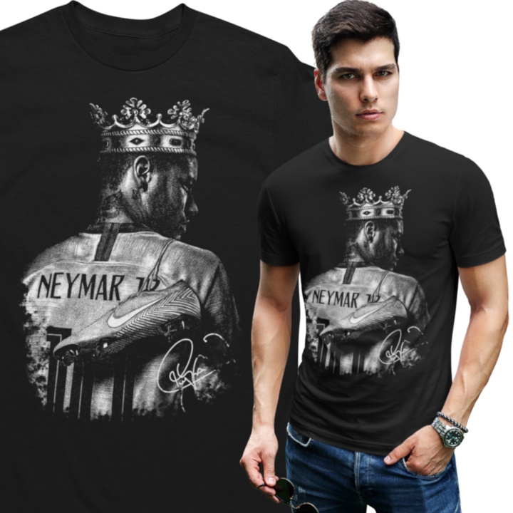 Artystyczny, monochromatyczny nadruk przedstawiający Neymara w królewskiej stylizacji podkreśla jego status ikony współczesnej piłki nożnej. Korona i dynamiczna sylwetka nadają koszulce mocny, prestiżowy charakter, który przyciąga wzrok i wyróżnia ją na tle innych koszulek sportowych.