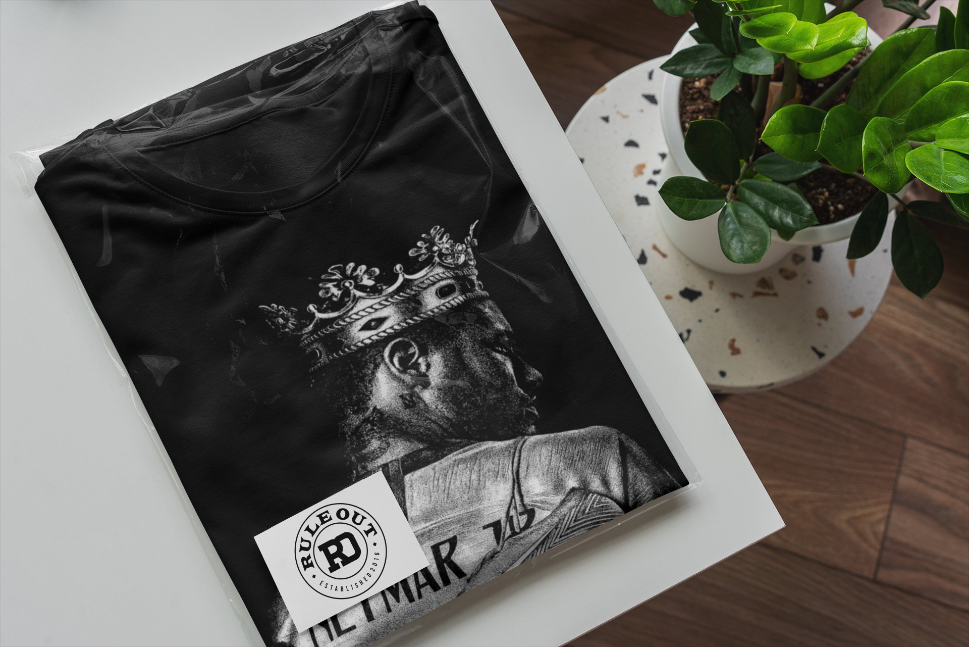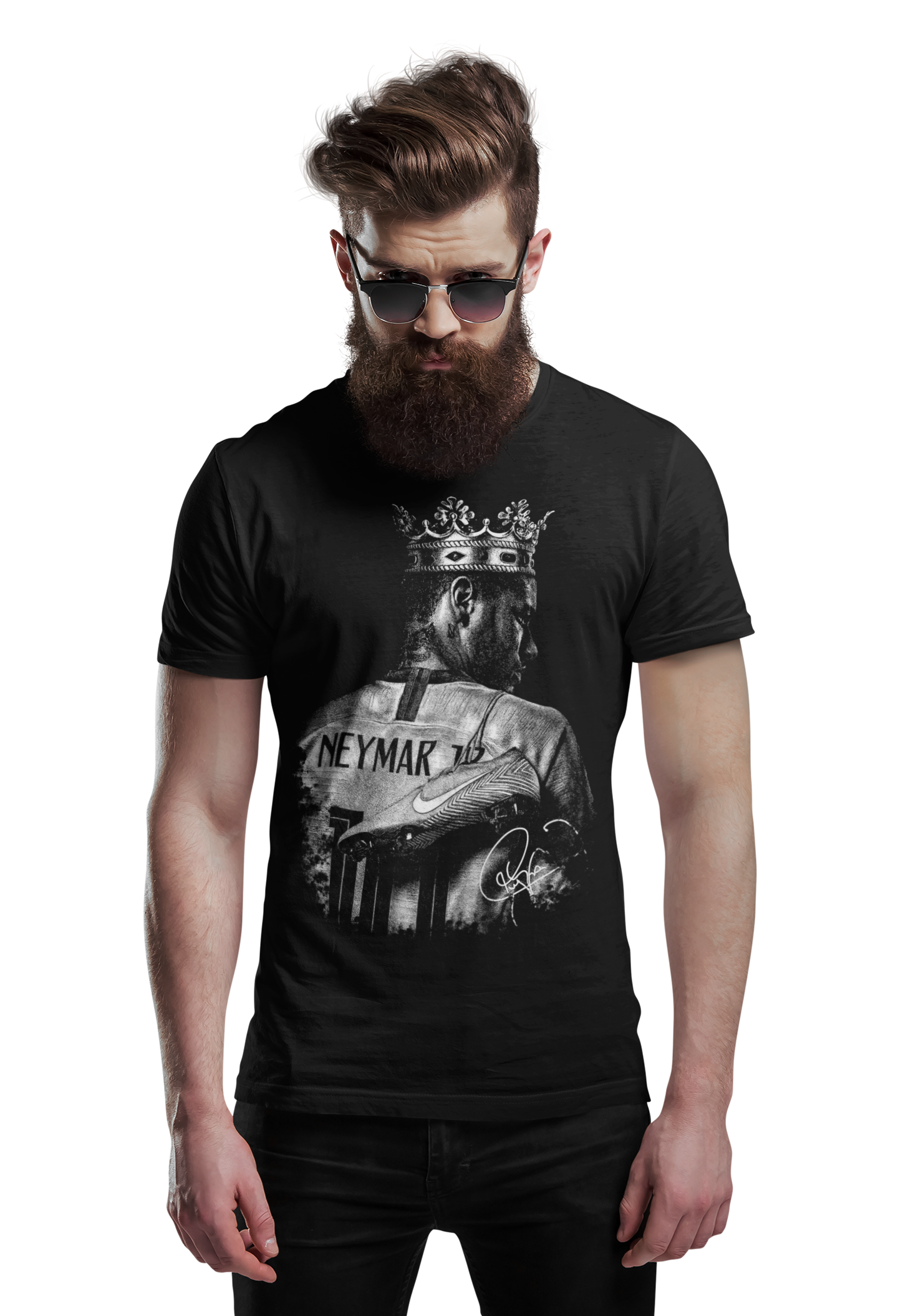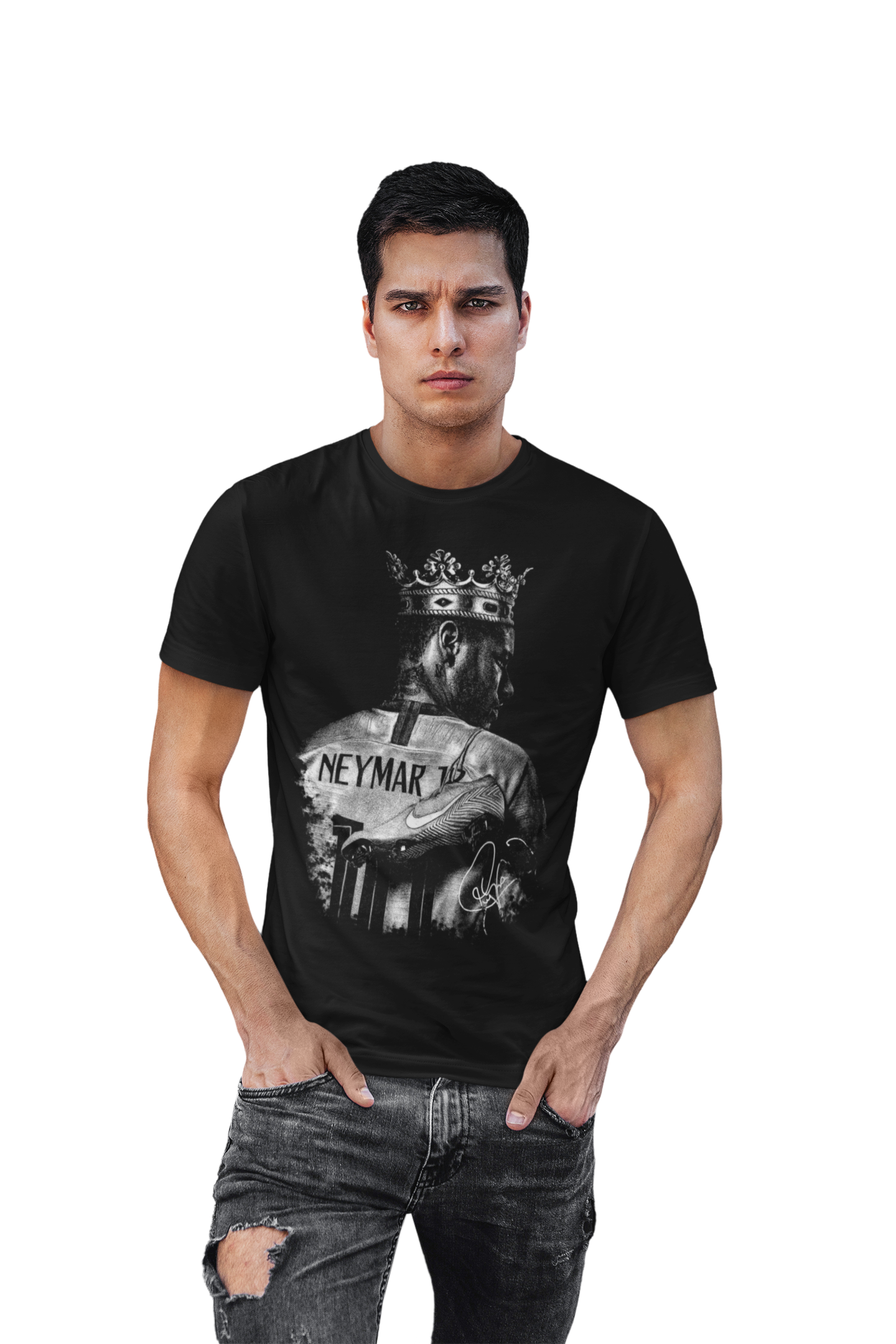 Artystyczny, monochromatyczny nadruk przedstawiający Neymara w królewskiej stylizacji podkreśla jego status ikony współczesnej piłki nożnej. Korona i dynamiczna sylwetka nadają koszulce mocny, prestiżowy charakter, który przyciąga wzrok i wyróżnia ją na tle innych koszulek sportowych.