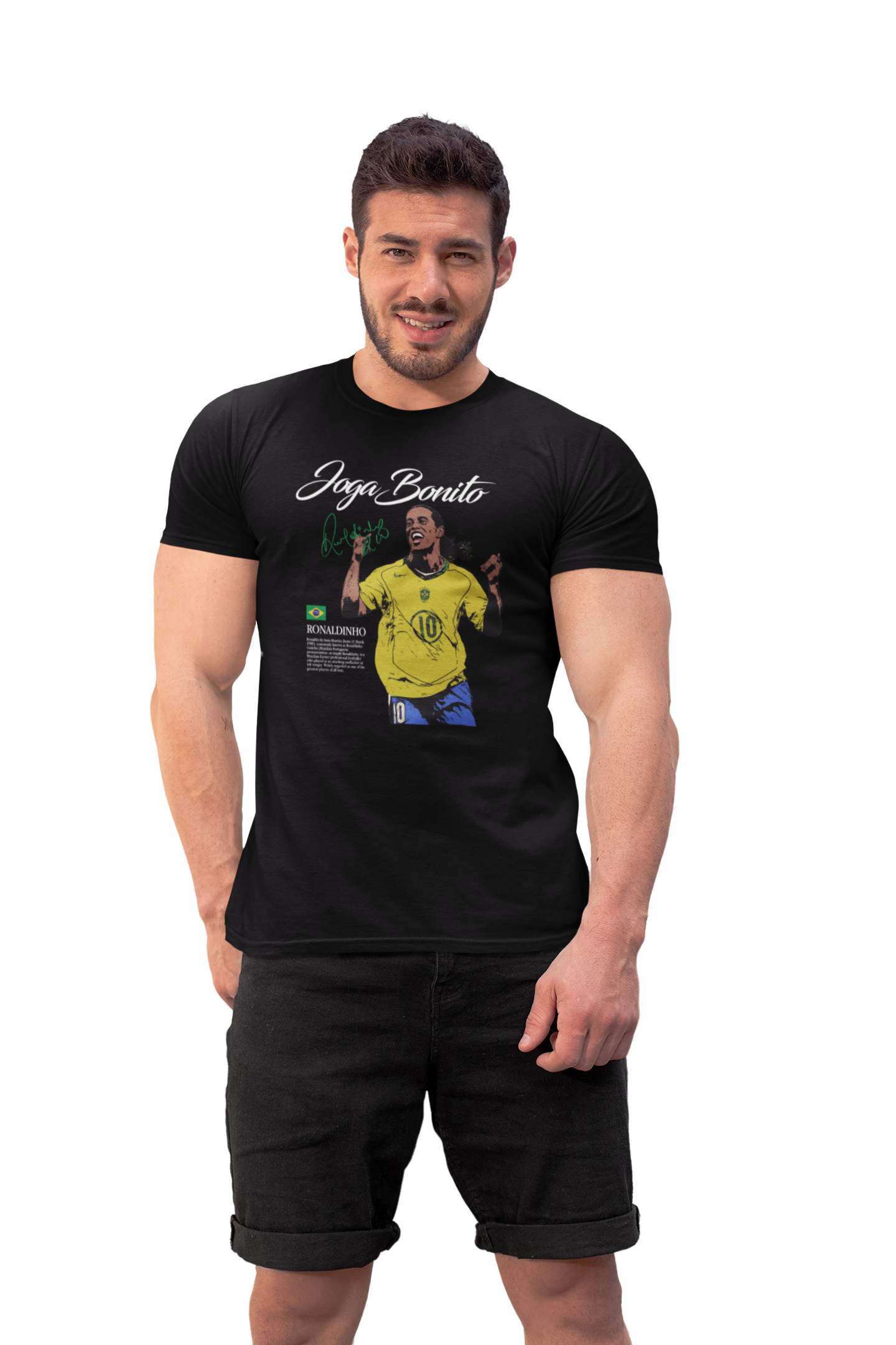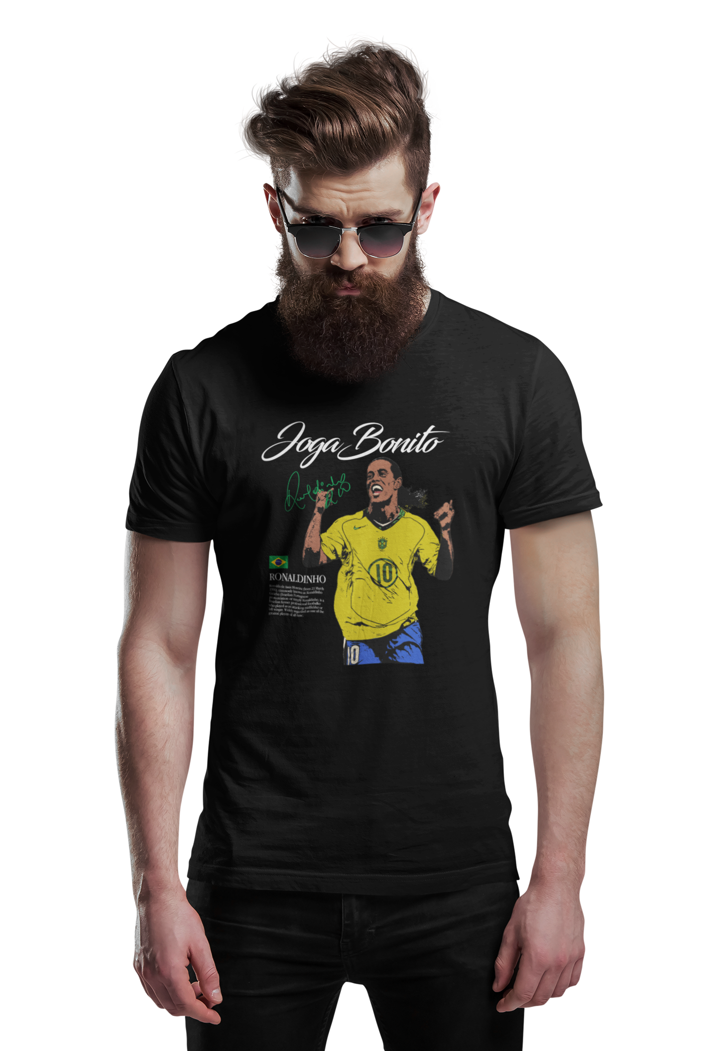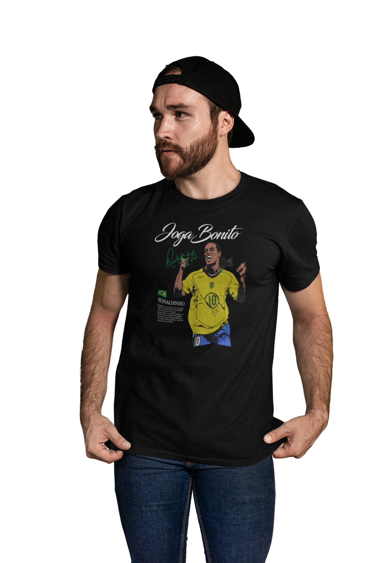 Ta wyjątkowa czarna koszulka męska z wizerunkiem Ronaldinho to obowiązkowa pozycja dla każdego fana pięknej, technicznej piłki nożnej. Ronaldinho – ikona brazylijskiego futbolu, symbol radości z gry i hasła „Joga Bonito” – teraz w formie stylowego, kolekcjonerskiego t-shirtu.