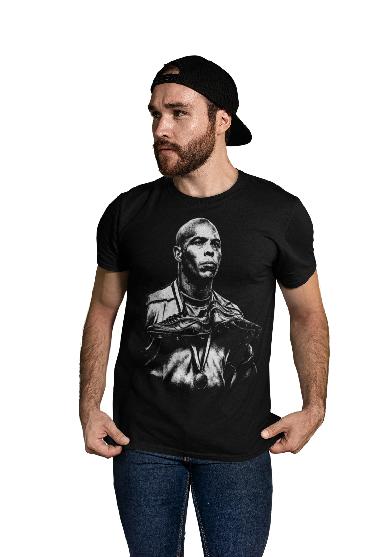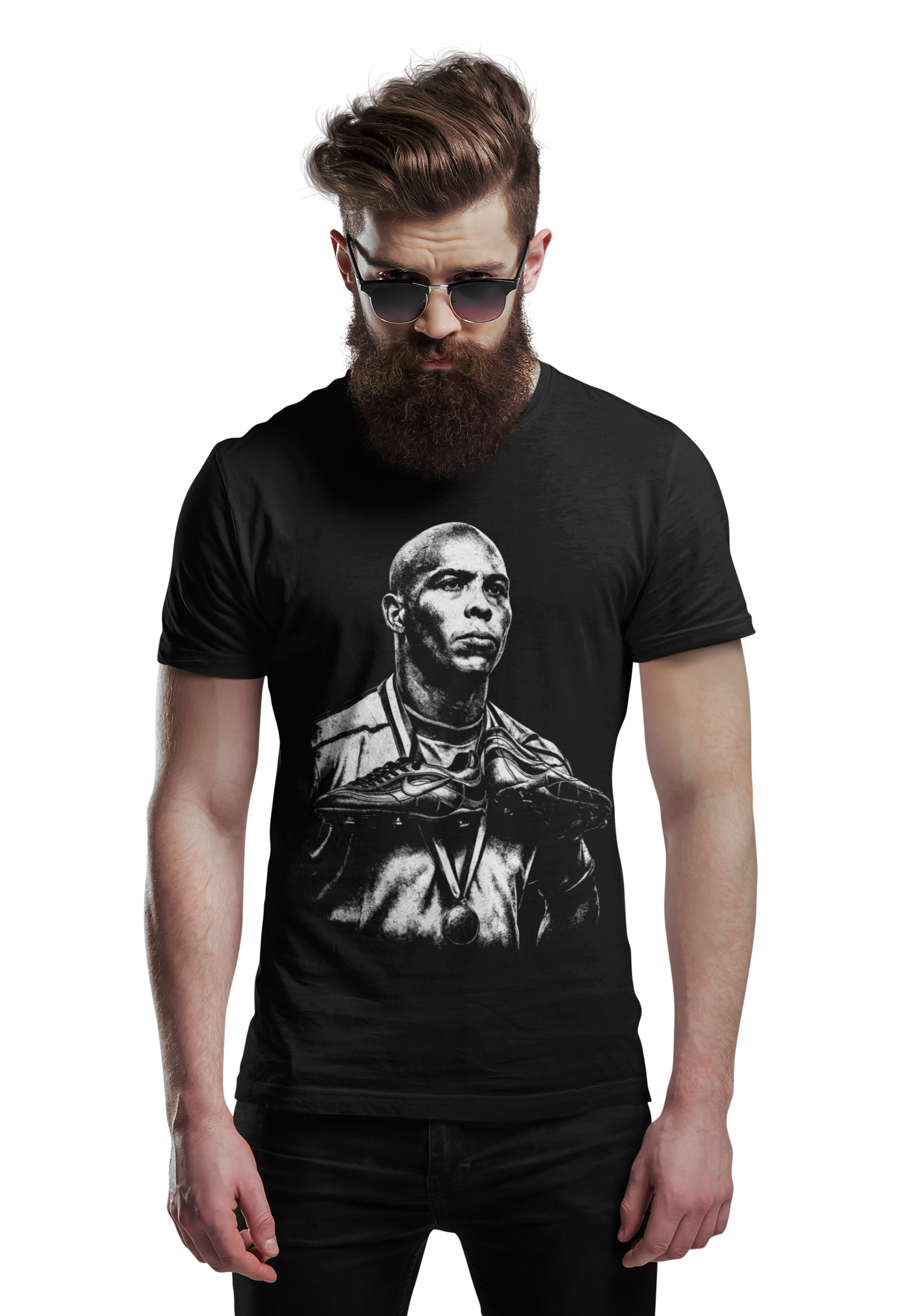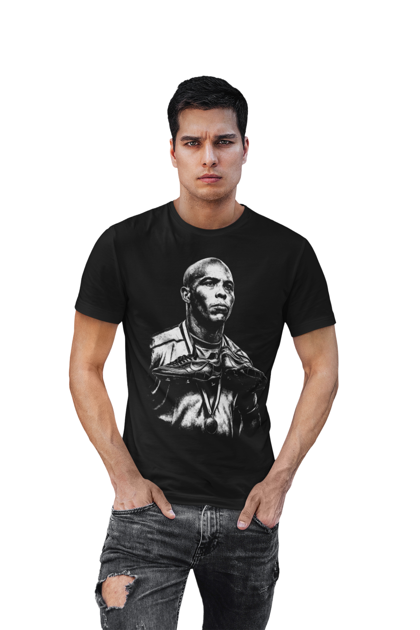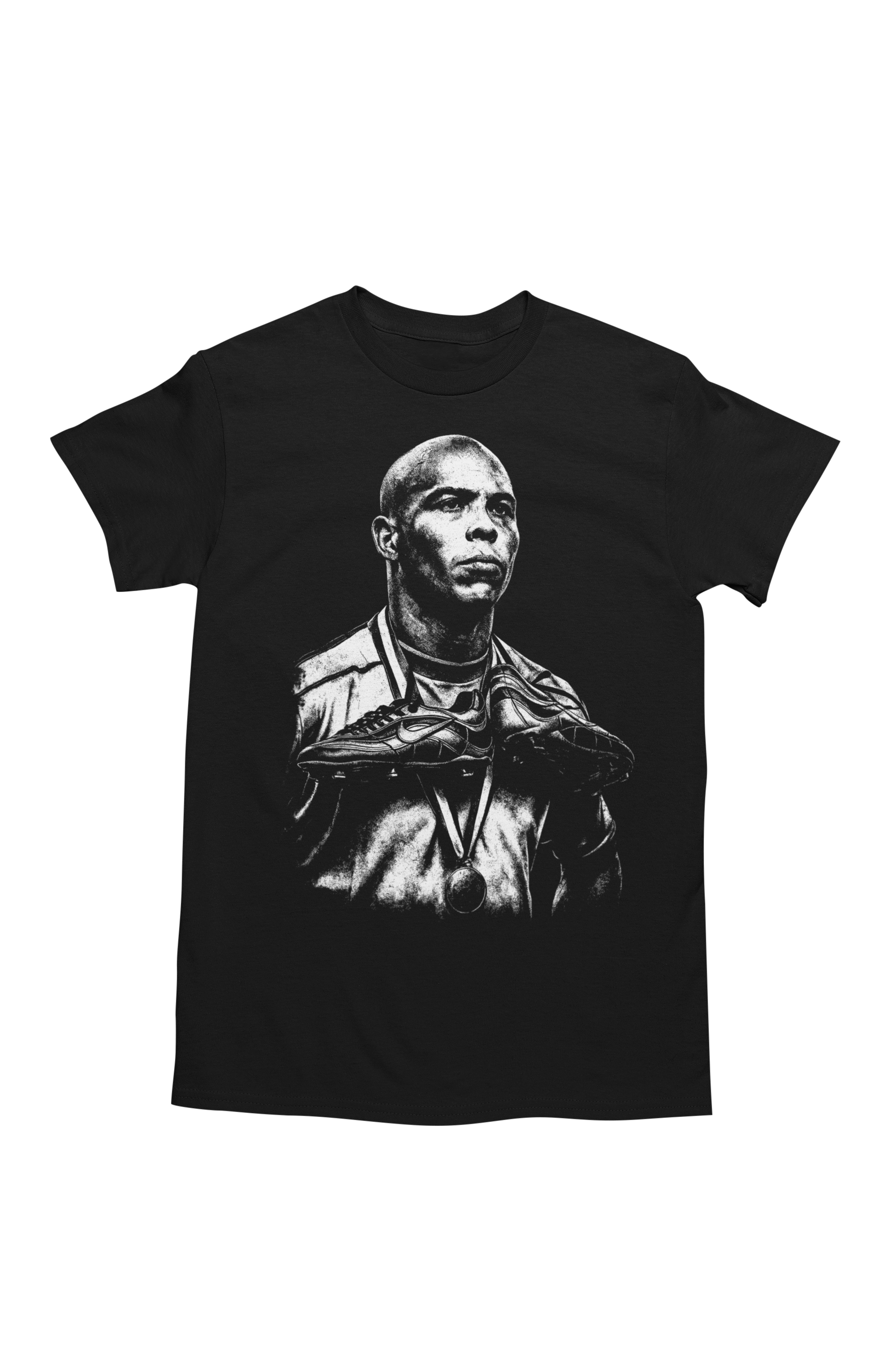 Artystyczny, monochromatyczny nadruk przedstawiający Ronaldo Nazário w ikonicznym, triumfalnym ujęciu podkreśla jego legendarny status oraz niezapomniane momenty, które zapisały się w historii futbolu. Surowa, kontrastowa grafika nadaje koszulce charakter i prestiżowy wygląd.