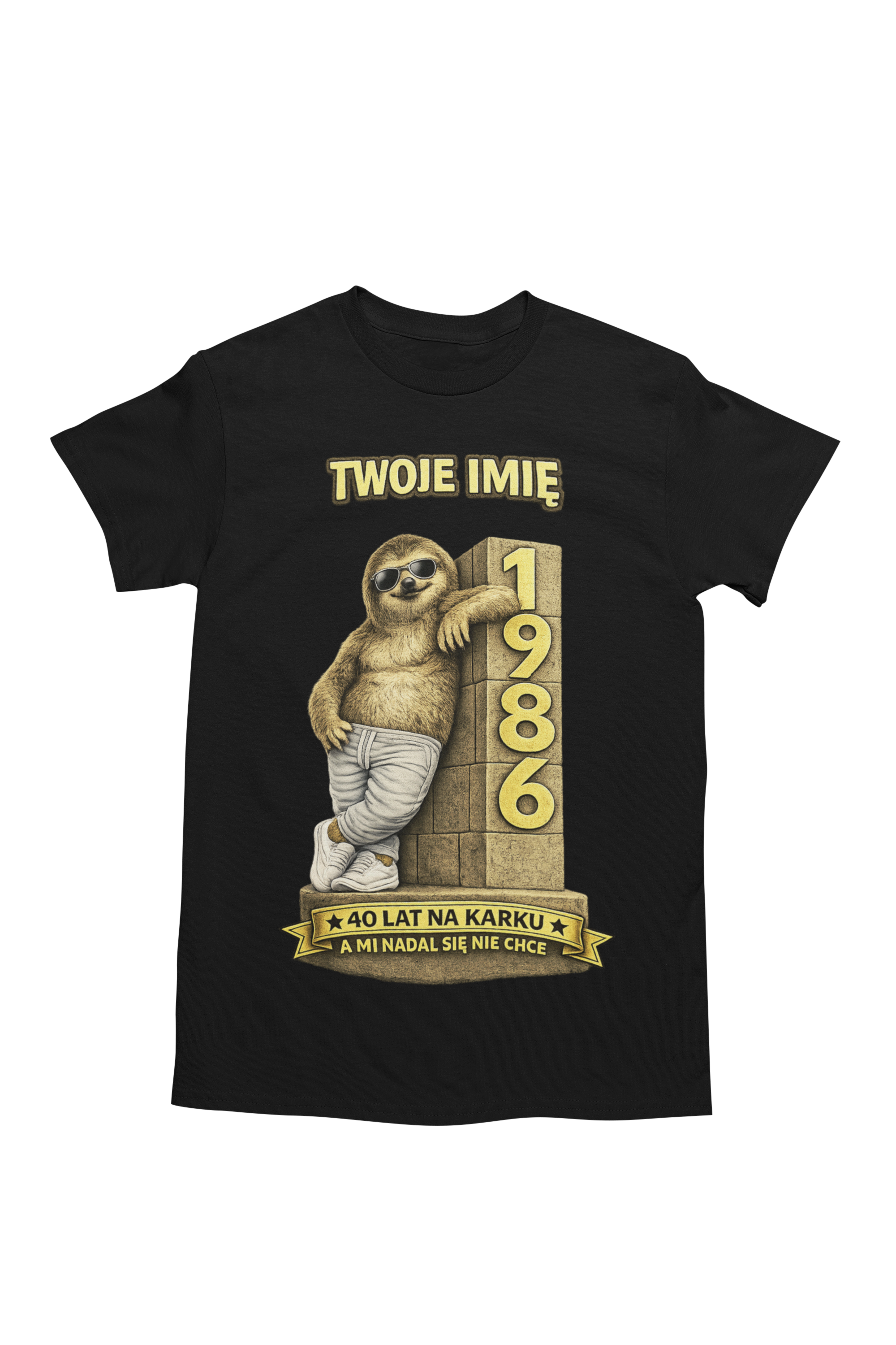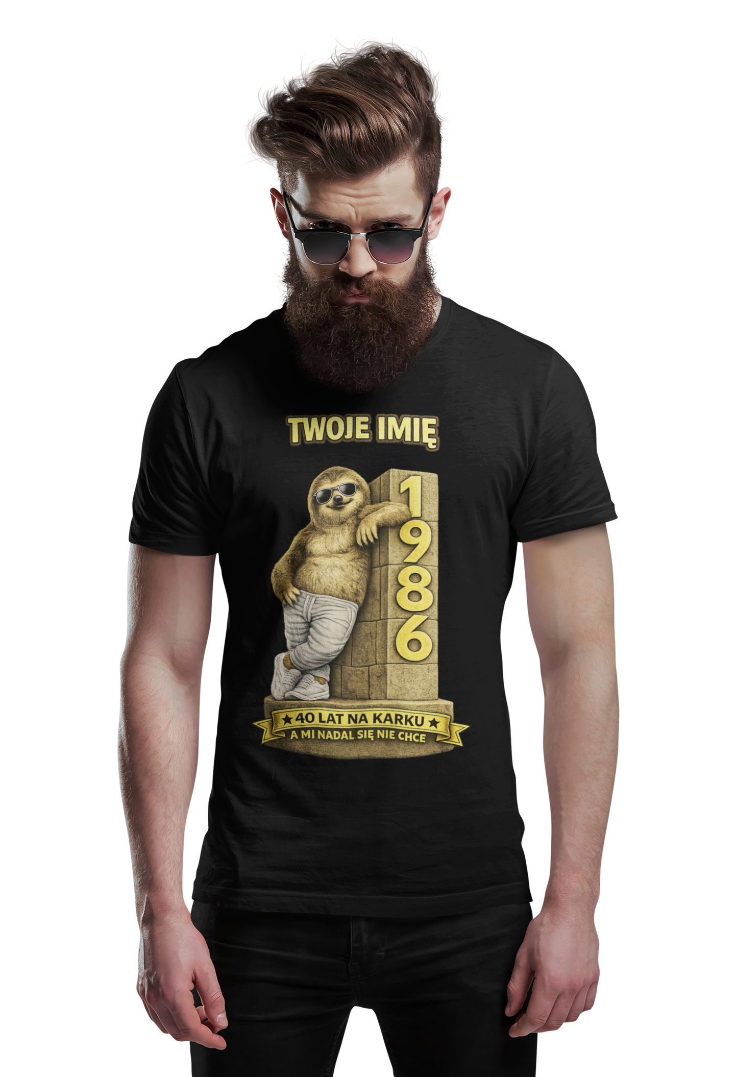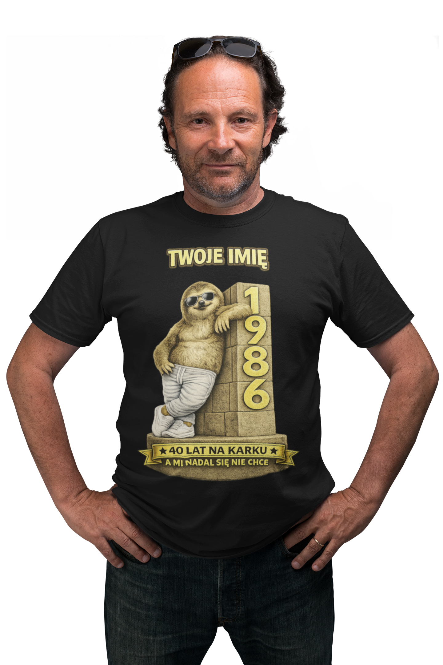 Ta personalizowana koszulka „40 lat na karku, a mi nadal się nie chce” to idealny prezent dla mężczyzny z dystansem do siebie, poczuciem humoru i luźnym podejściem do życia. Zabawna grafika z charakterystycznym motywem oraz możliwością dodania imienia i roku urodzenia (1986) sprawiają, że koszulka staje się oryginalną i trafioną pamiątką na okrągłe urodziny.