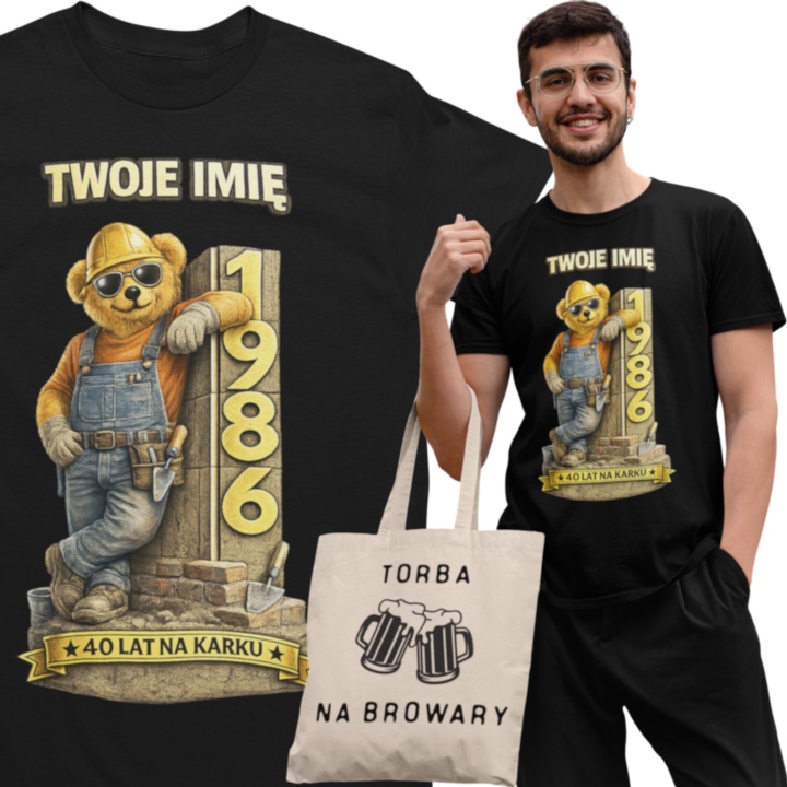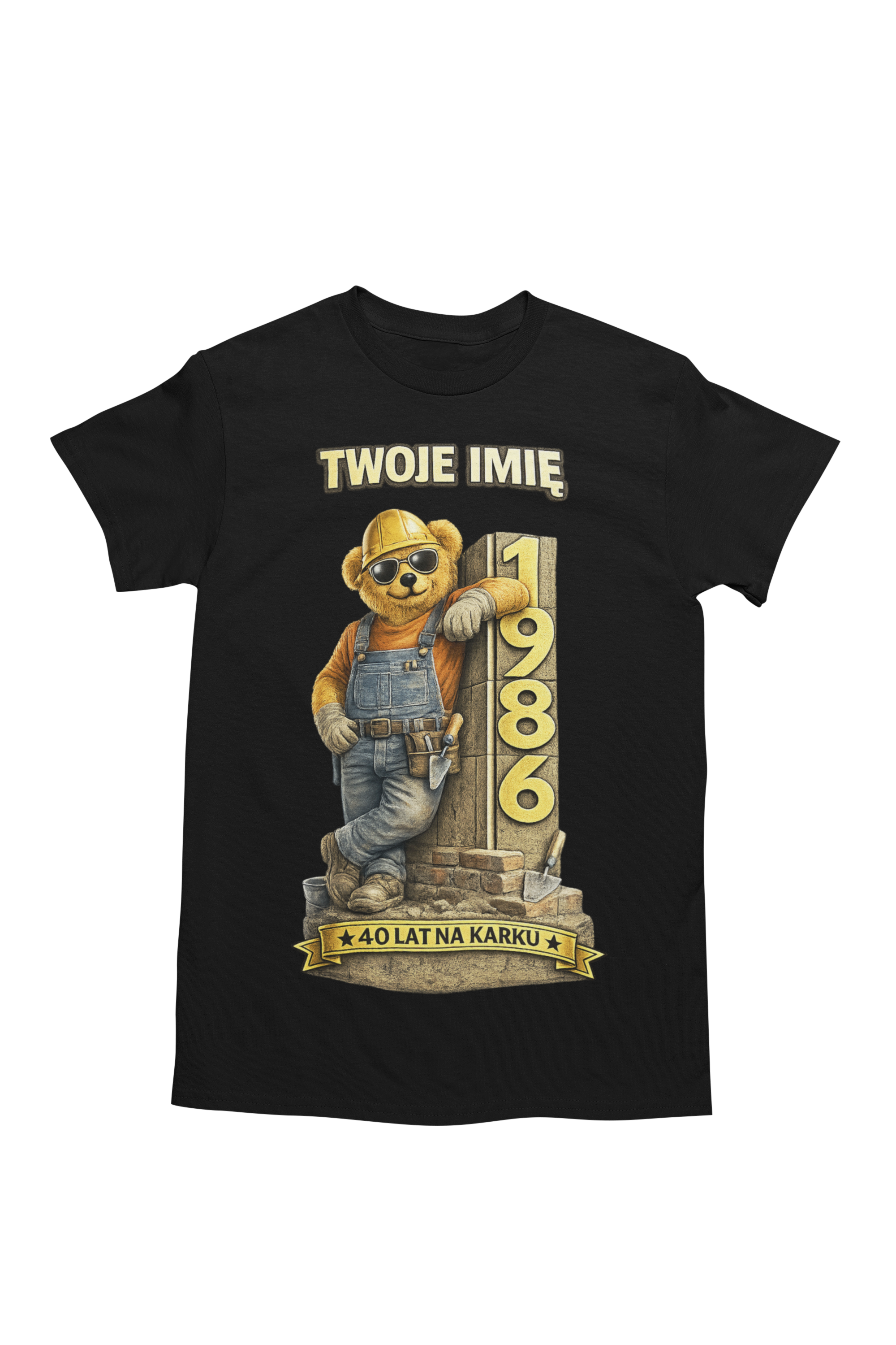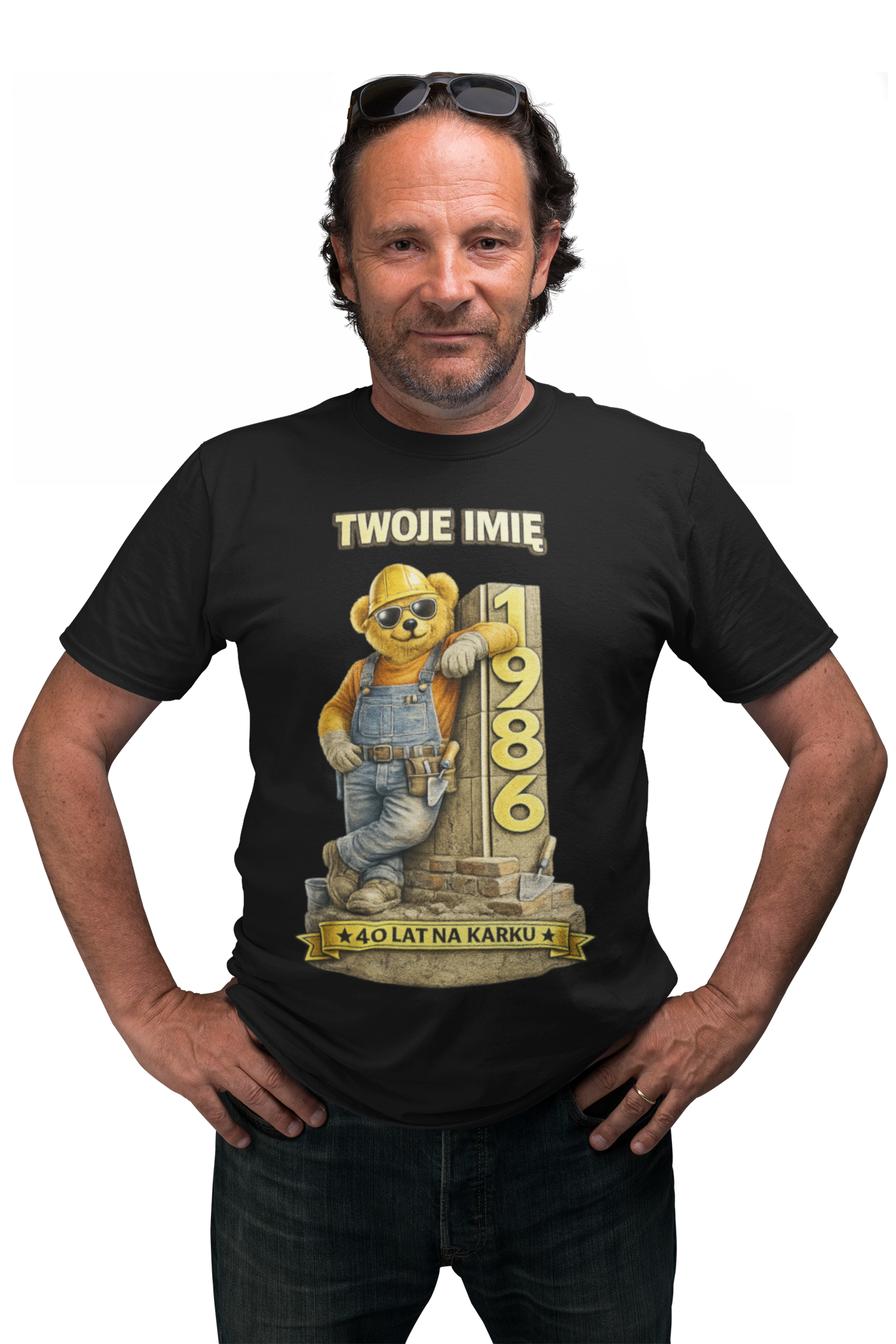 Ta personalizowana koszulka „40 lat na karku – 1986” to idealny prezent urodzinowy dla murarza, który z dumą wykonuje swój fach, a do życia podchodzi z dystansem i poczuciem humoru. Wyrazista grafika przedstawiająca misia w stroju murarskim, wraz z możliwością dodania imienia i roku urodzenia, sprawia, że koszulka staje się wyjątkową i osobistą pamiątką na okrągłe urodziny.