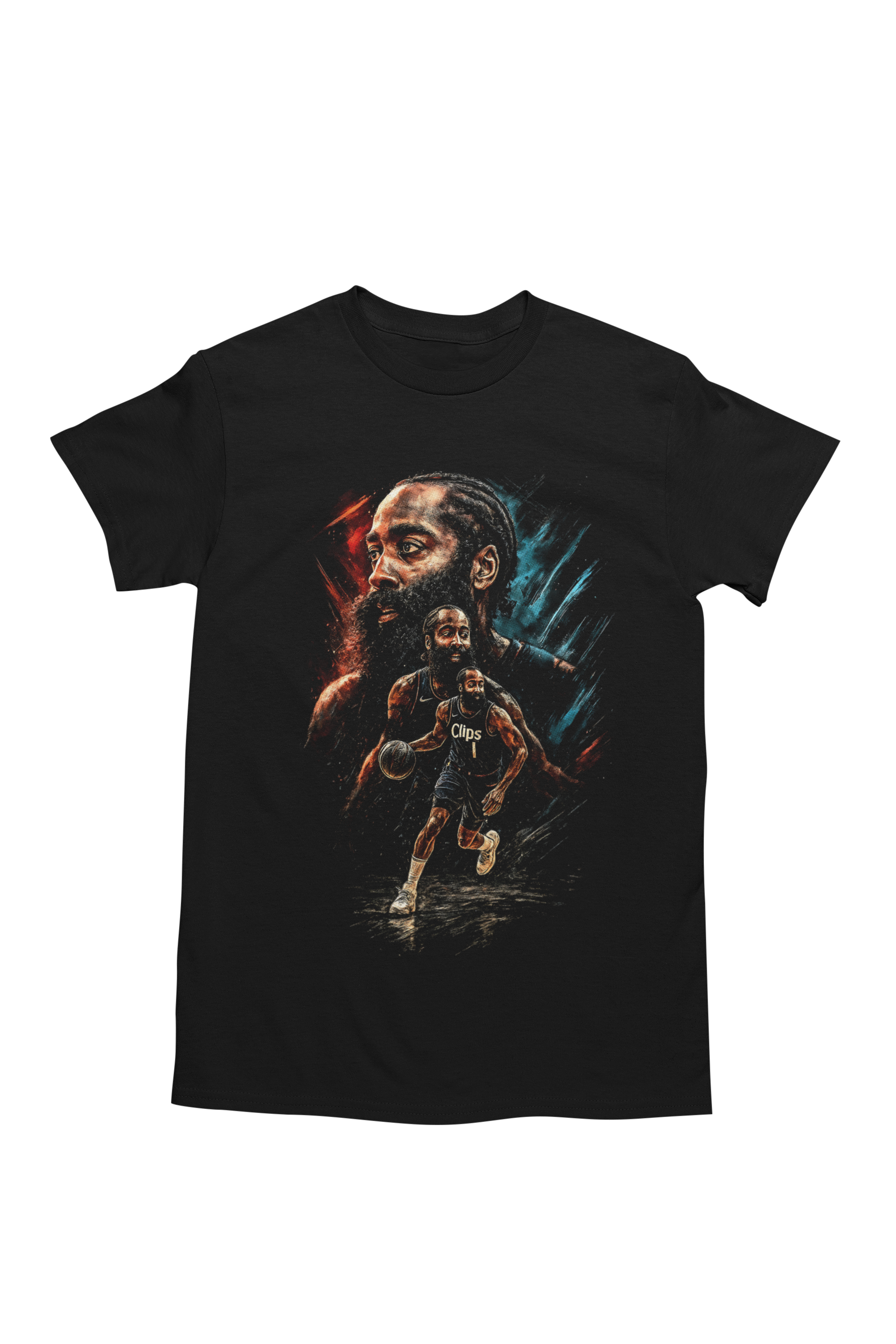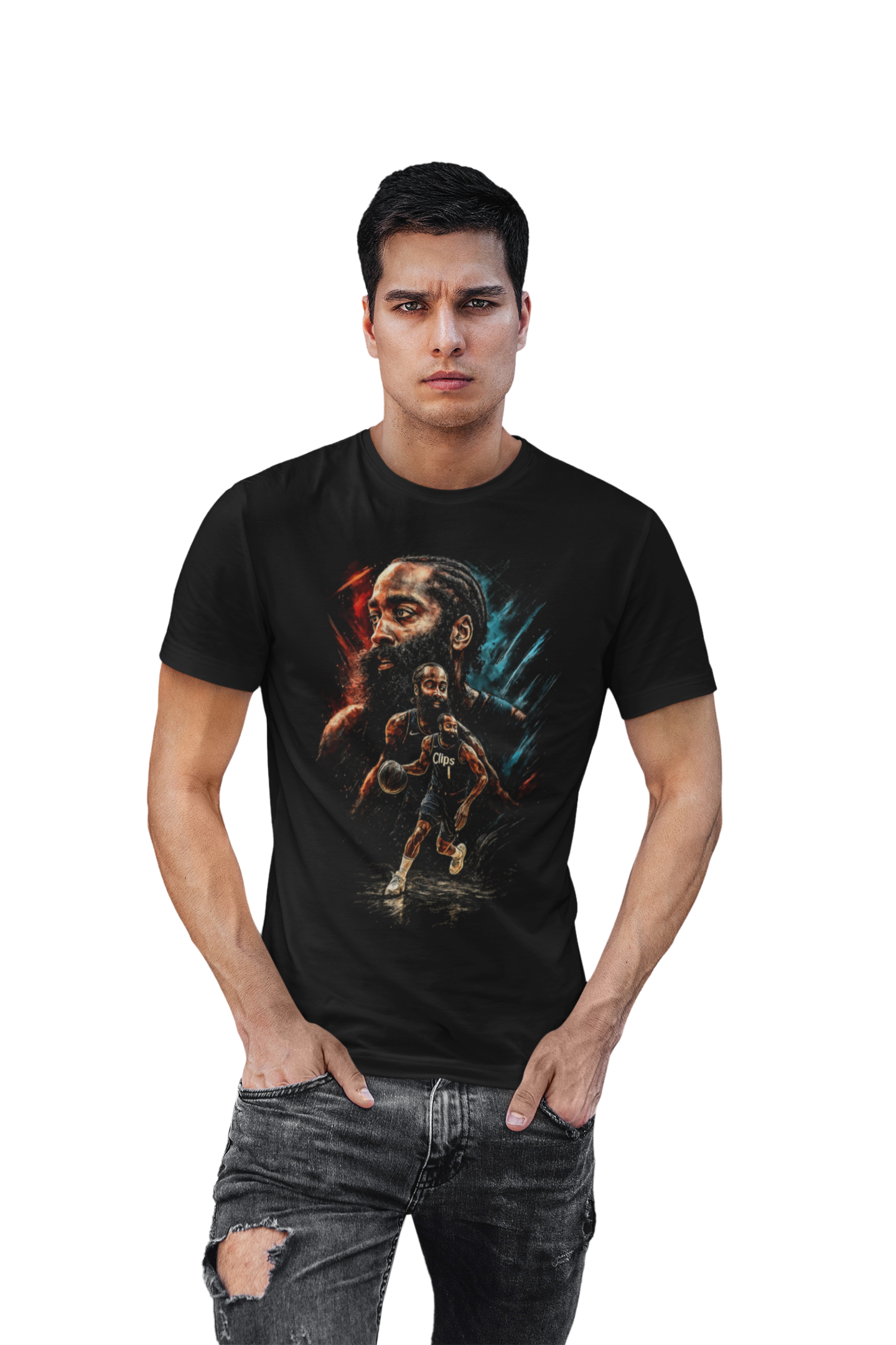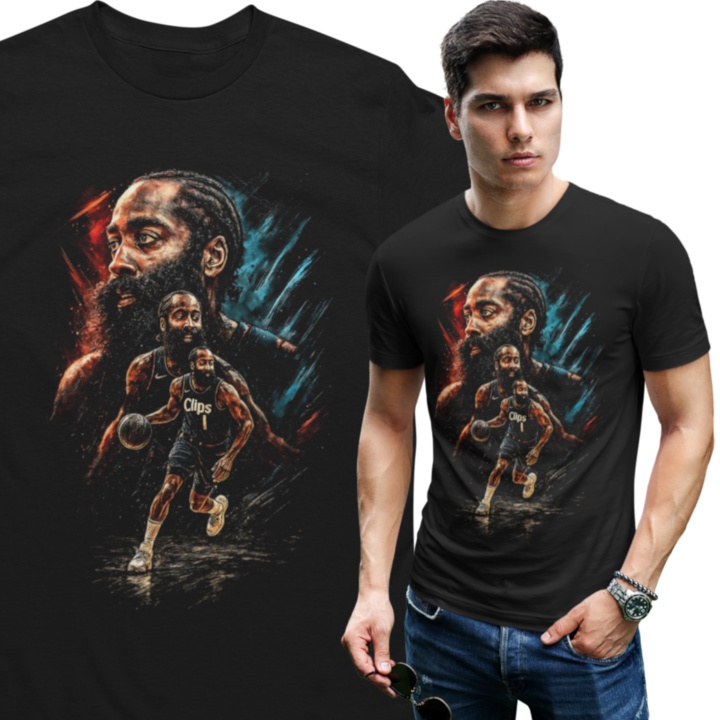 Ta męska koszulka koszykarska inspirowana Jamesem Hardenem to idealna propozycja dla fanów ligi NBA, nowoczesnej koszykówki i drużyny Los Angeles Clippers. Artystyczny nadruk przedstawia Jamesa Hardena w dynamicznej akcji meczowej oraz w wyrazistym portrecie, co doskonale oddaje jego boiskową charyzmę, pewność siebie i ofensywny styl gry, z którego słynie w całej lidze NBA.