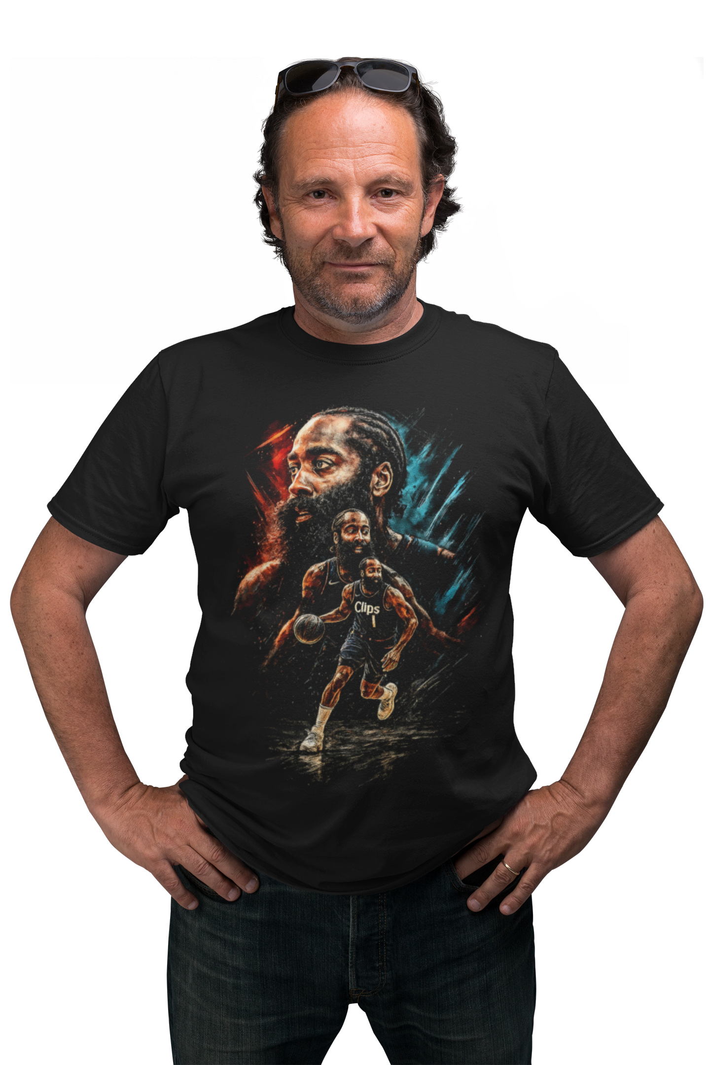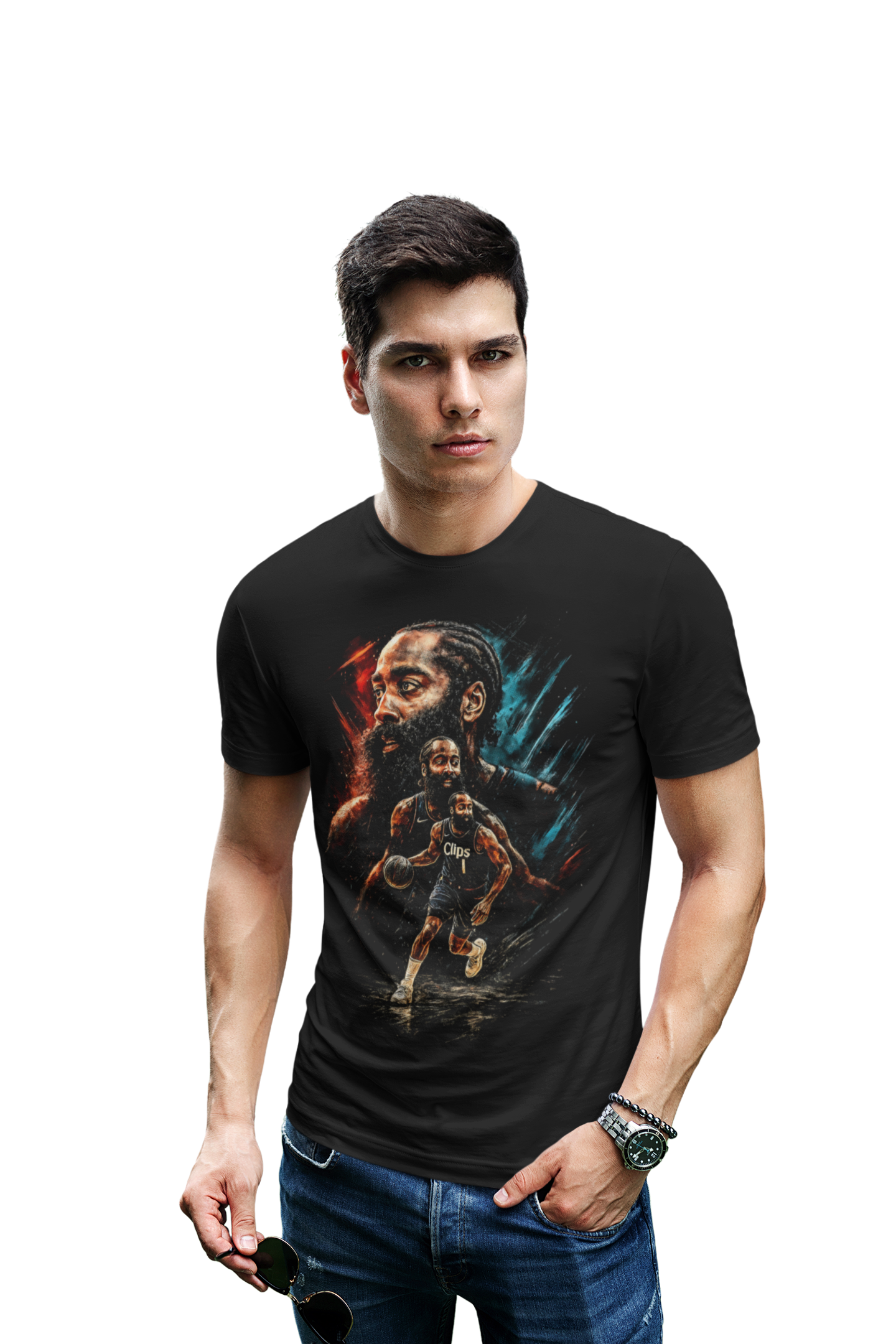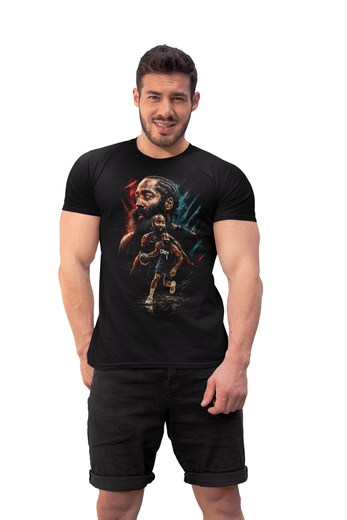 Ta męska koszulka koszykarska inspirowana Jamesem Hardenem to idealna propozycja dla fanów ligi NBA, nowoczesnej koszykówki i drużyny Los Angeles Clippers. Artystyczny nadruk przedstawia Jamesa Hardena w dynamicznej akcji meczowej oraz w wyrazistym portrecie, co doskonale oddaje jego boiskową charyzmę, pewność siebie i ofensywny styl gry, z którego słynie w całej lidze NBA.