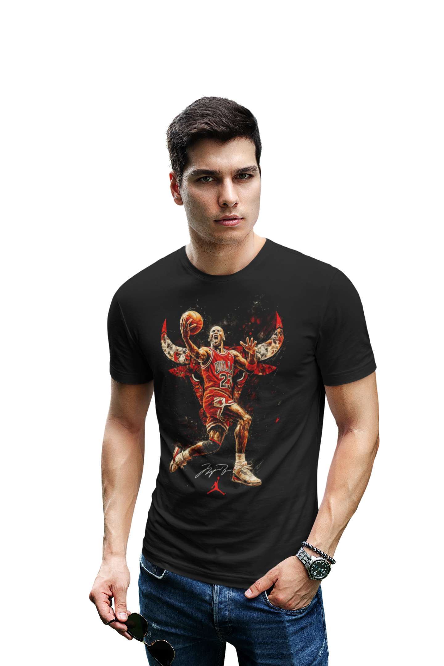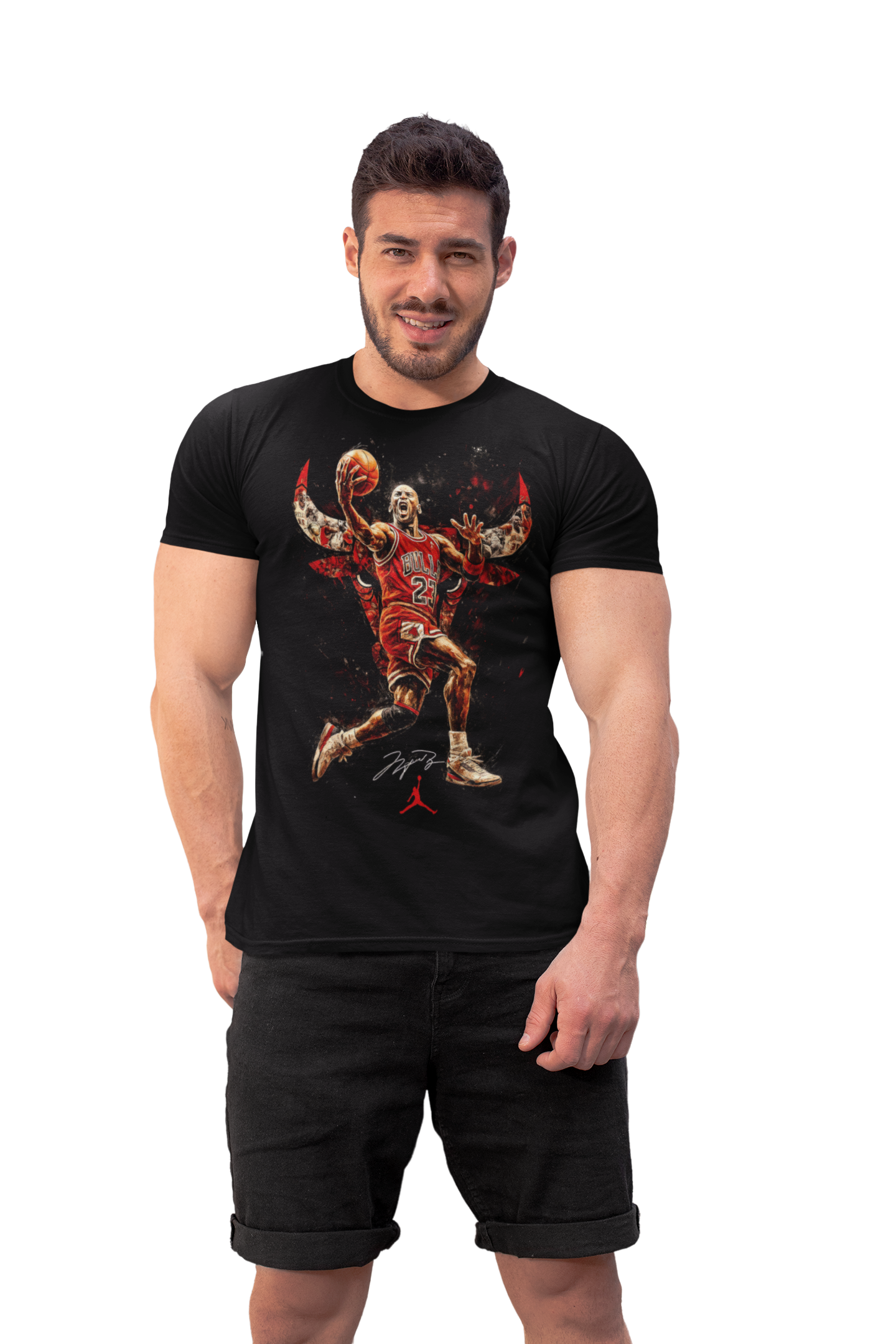 Ta męska koszulka koszykarska inspirowana Michaelem Jordanem to idealna propozycja dla fanów ligi NBA, klasycznej koszykówki i legendarnej drużyny Chicago Bulls. Efektowny nadruk przedstawia Michaela Jordana w dynamicznej akcji pod koszem, w kultowym numerze 23 i barwach Bulls, co doskonale oddaje jego niepowtarzalny styl gry, agresję w ataku oraz mentalność zwycięzcy.