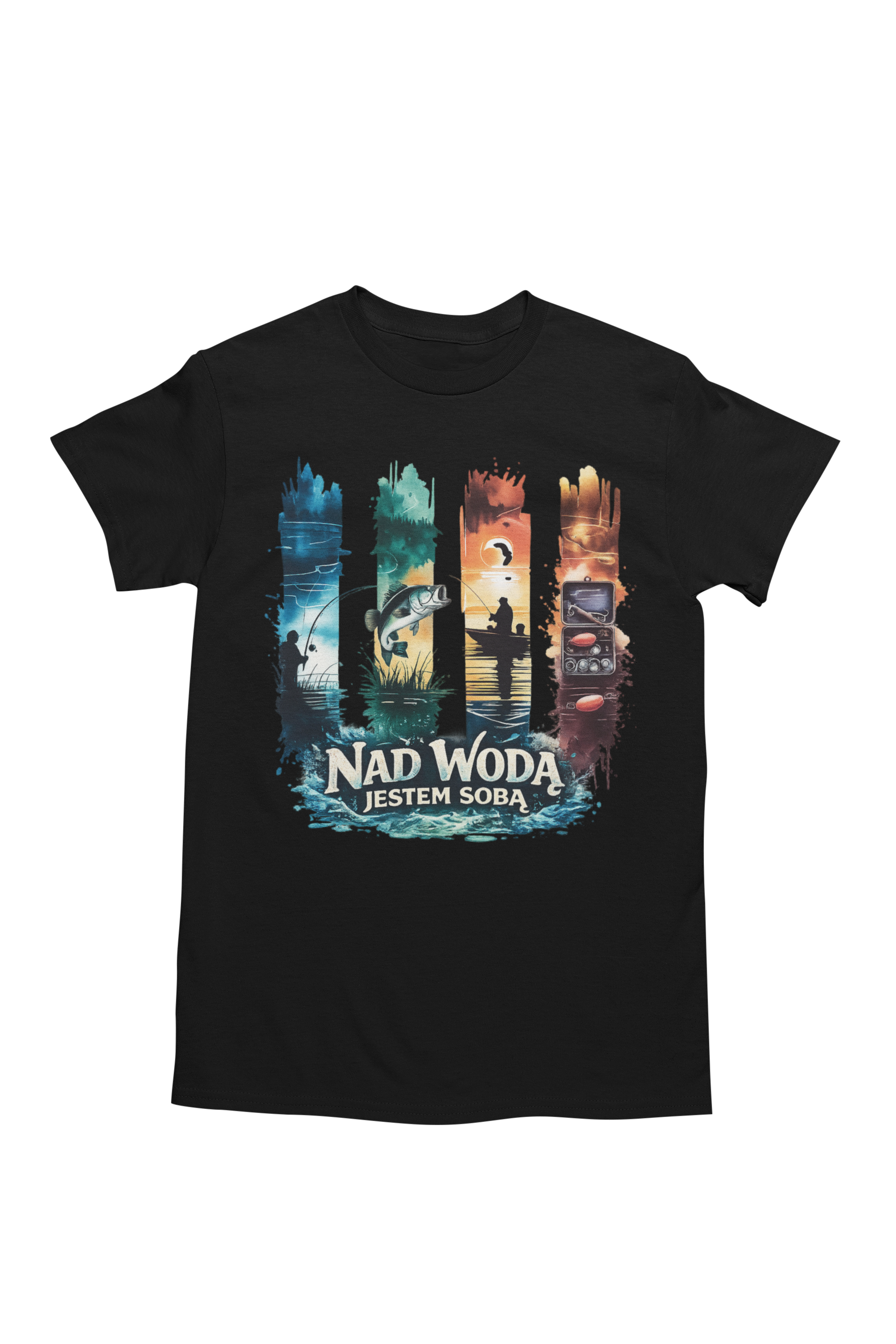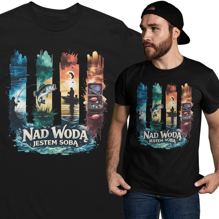 Koszulka wędkarska męska z napisem „Nad wodą jestem sobą” to idealny t-shirt dla każdego, kto odnajduje spokój i wolność podczas łowienia ryb. Klimatyczna grafika przedstawiająca sceny znad jeziora – wędkarza, rybę, zachód słońca oraz elementy wędkarskiego wyposażenia – doskonale oddaje atmosferę chwil spędzonych nad wodą. Motyw ten podkreśla pasję do wędkarstwa, natury oraz momentów ciszy i relaksu z wędką w ręku.