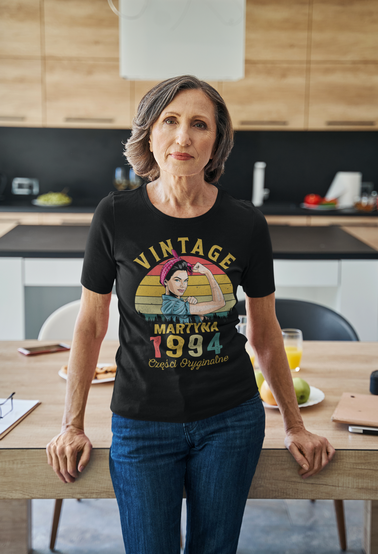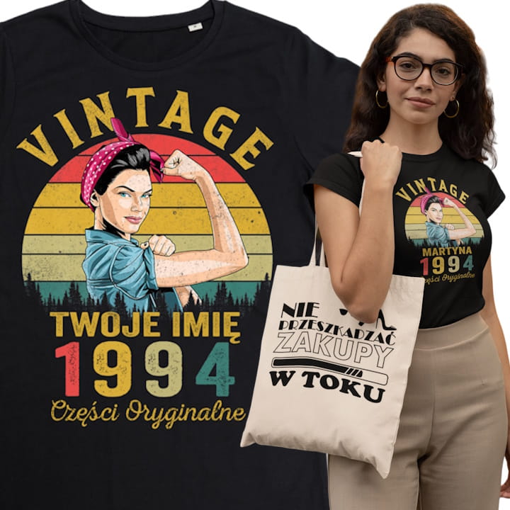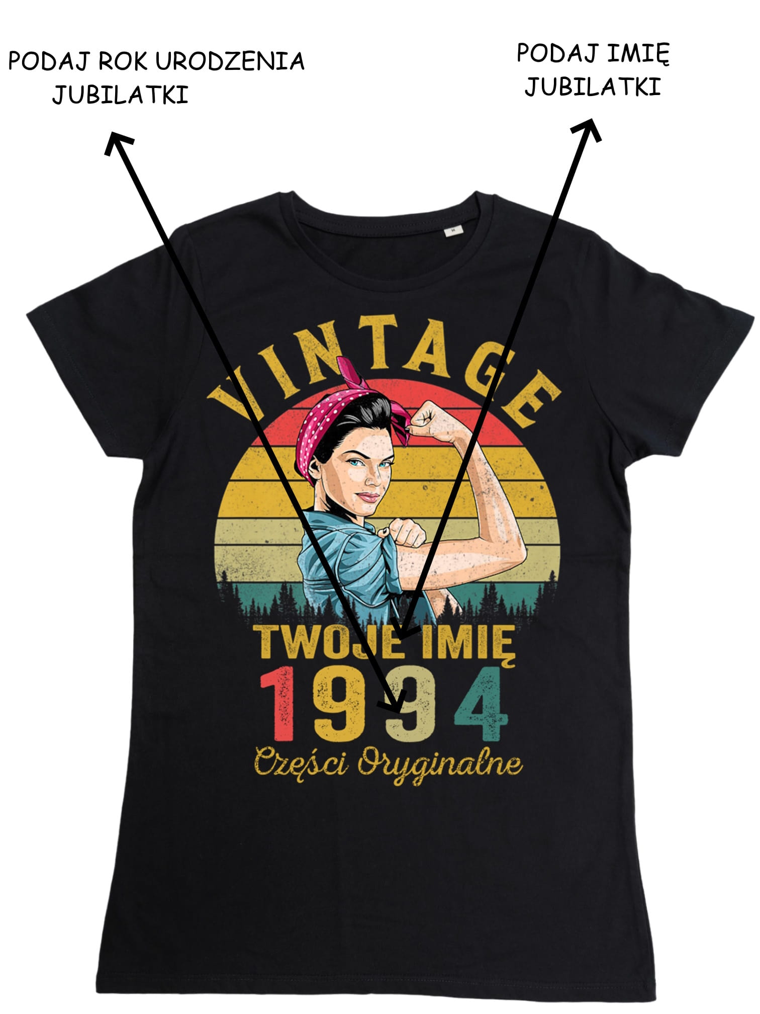 Koszulka z Nadrukiem Vintage z rokiem urodzenia oraz imieniem jubilatki, dla której kupujesz prezent: