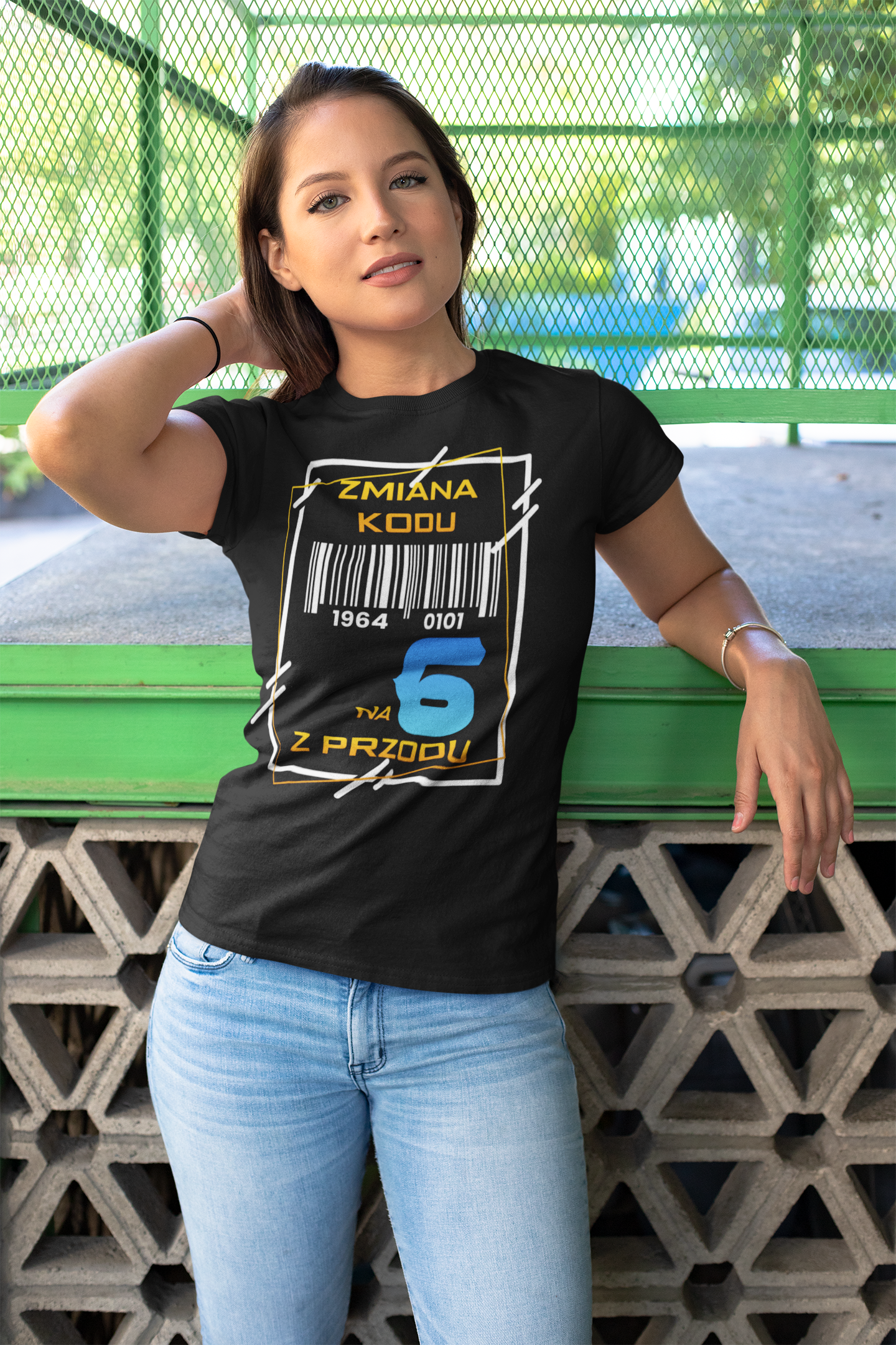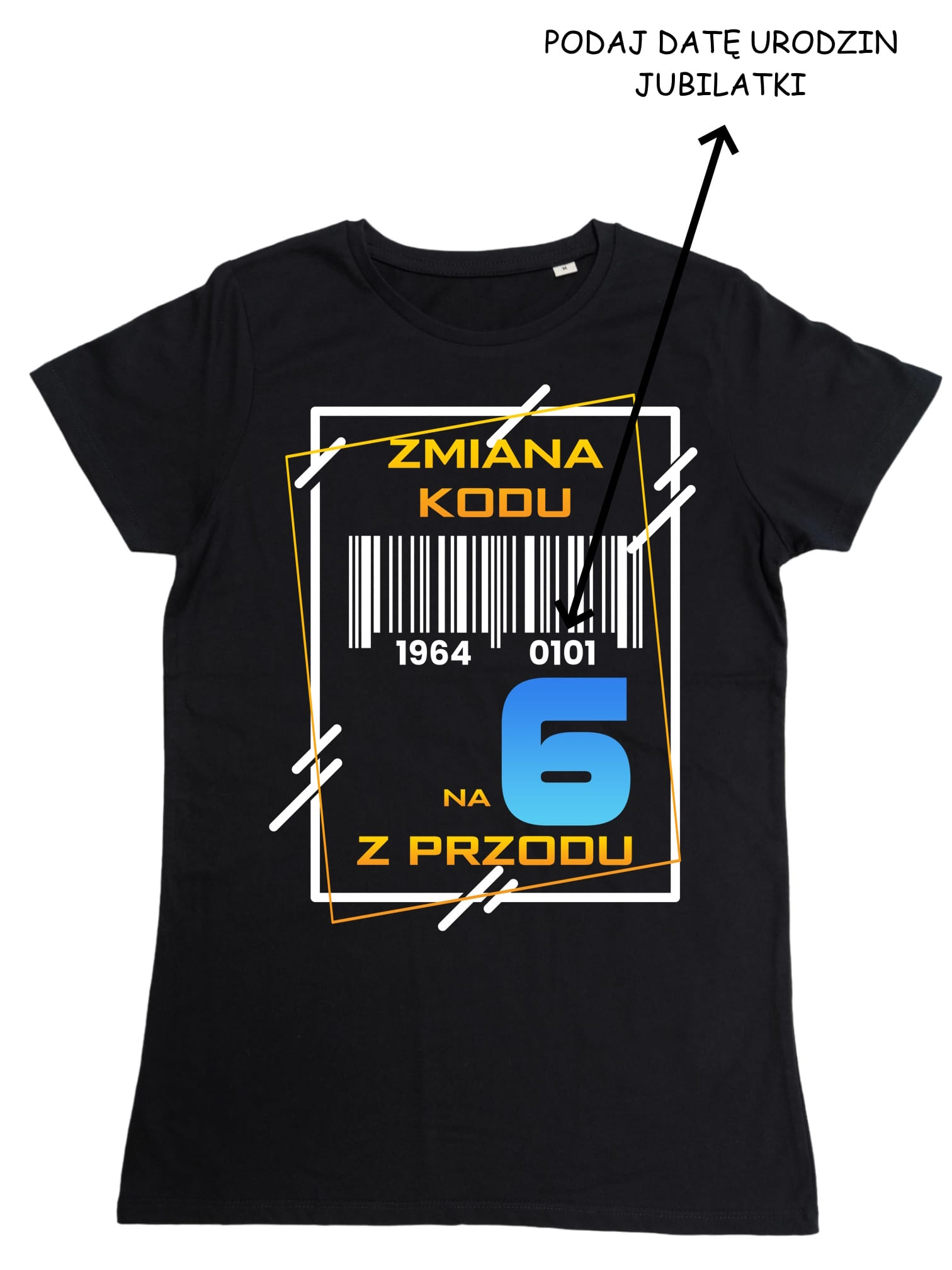 PERSONALIZOWANA DAMSKA KOSZULKA PREZENT NA 60 URODZINY ZMIANA KODU NA 6 Z PRZODU TORBA GRATIS