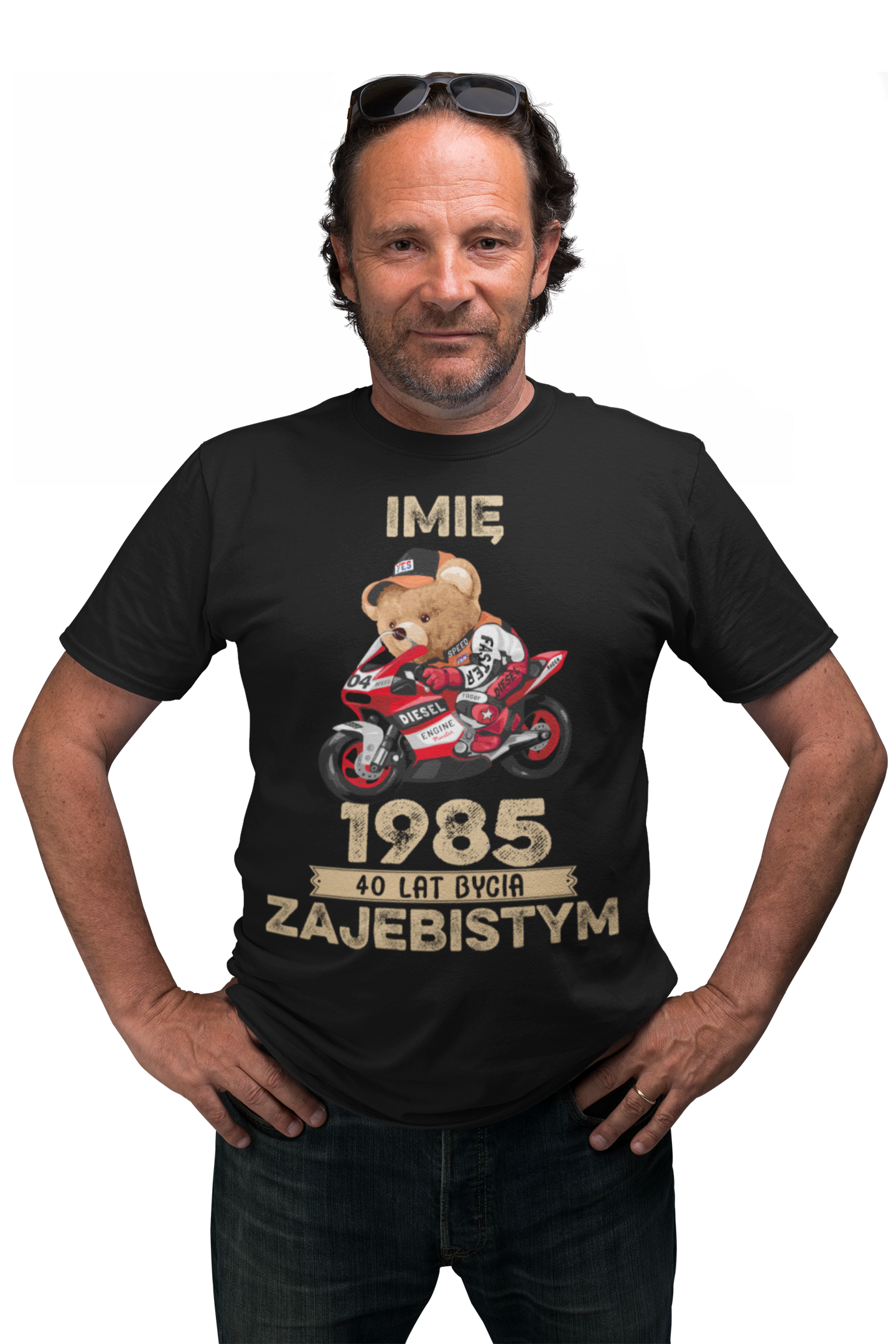 PERSONALIZOWANA KOSZULKA PREZENT NA URODZINY MIŚ NA ŚCIGACZU PODAJ IMIĘ I ROK