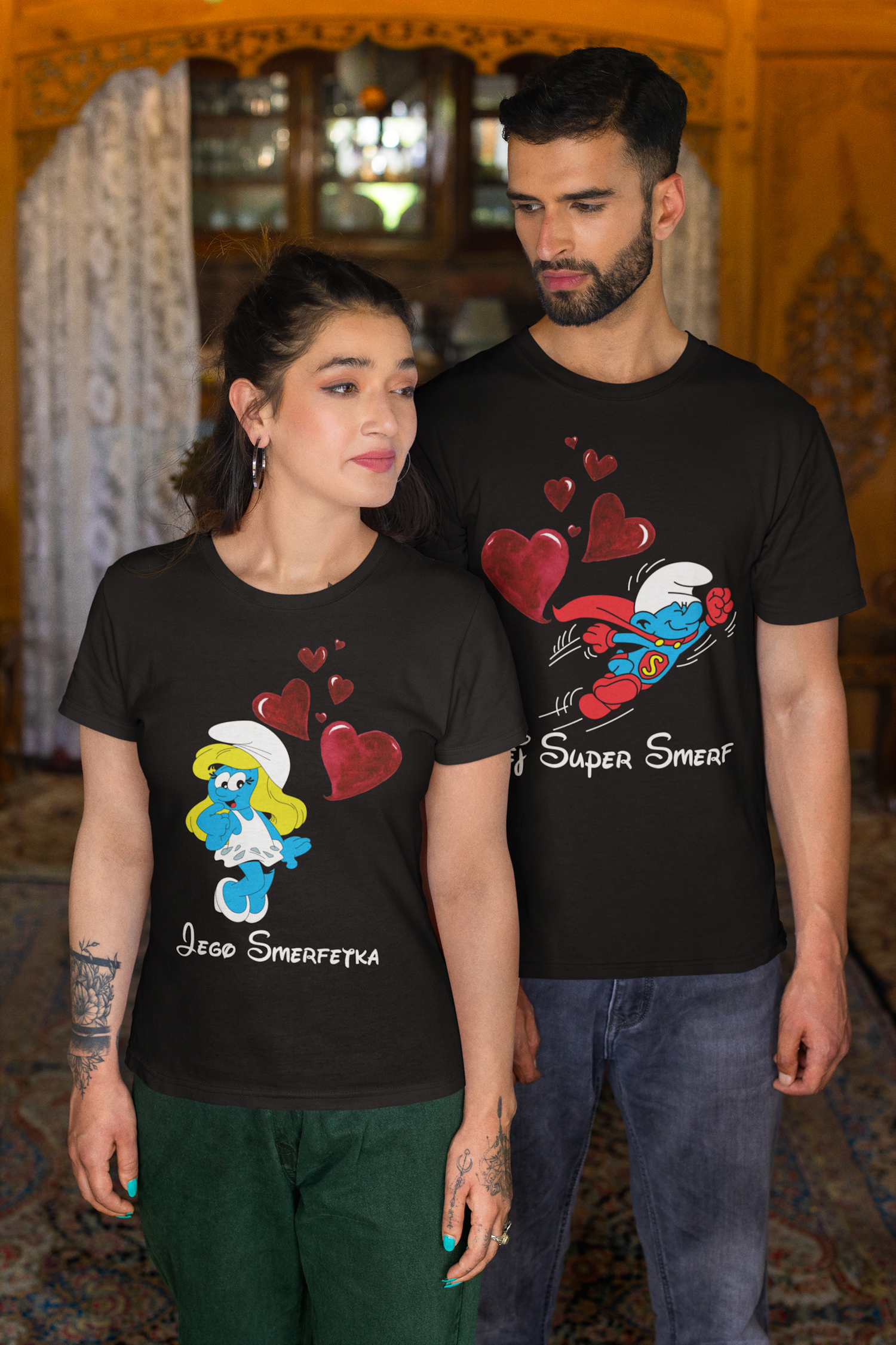ZESTAW KOSZULEK WALENTYNKOWYCH LOVE PREZENT NA WALENTYNKI DLA PARY SMERFETKA I SUPER SMERF SMERFY